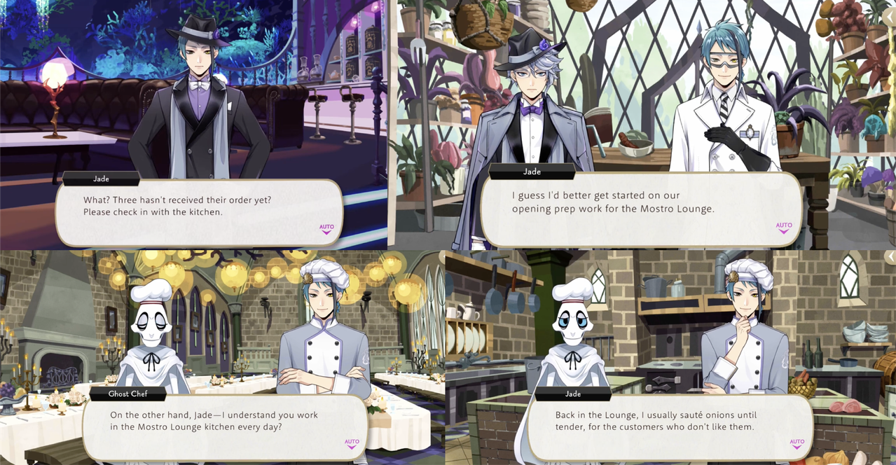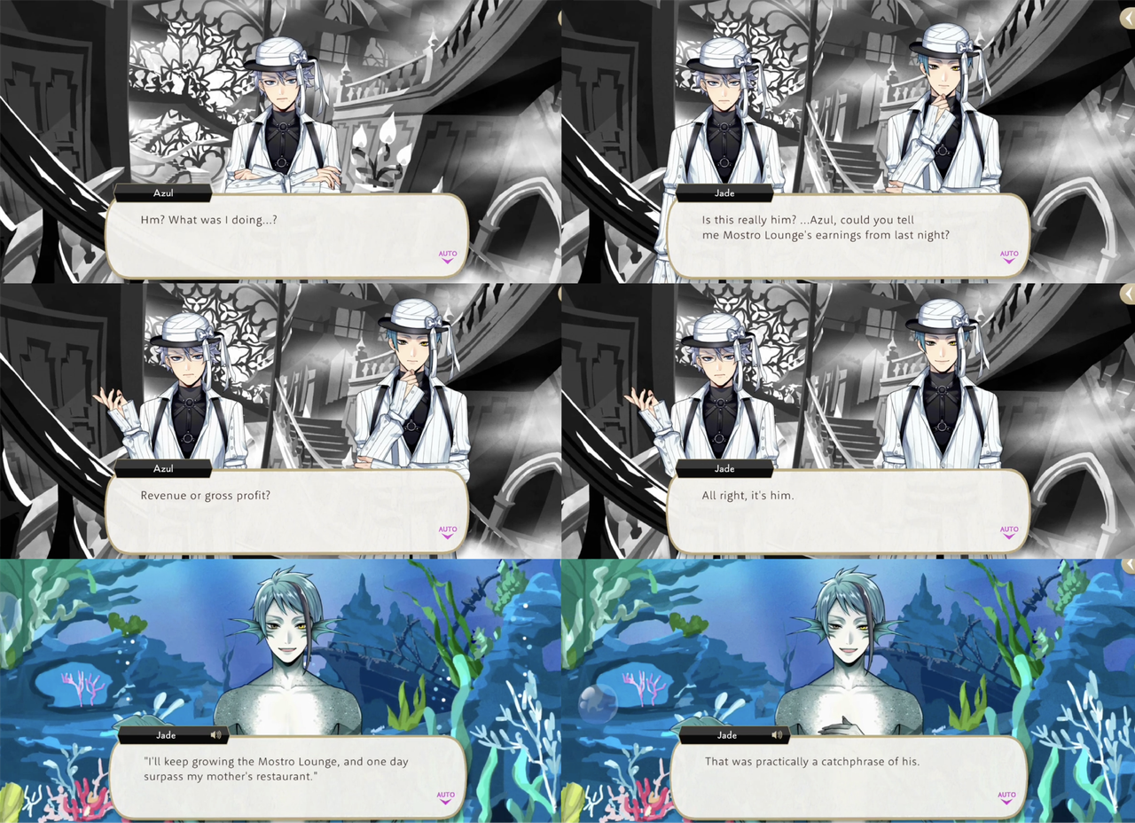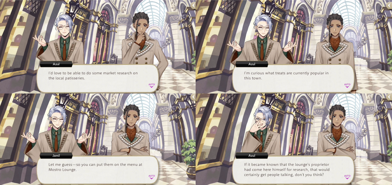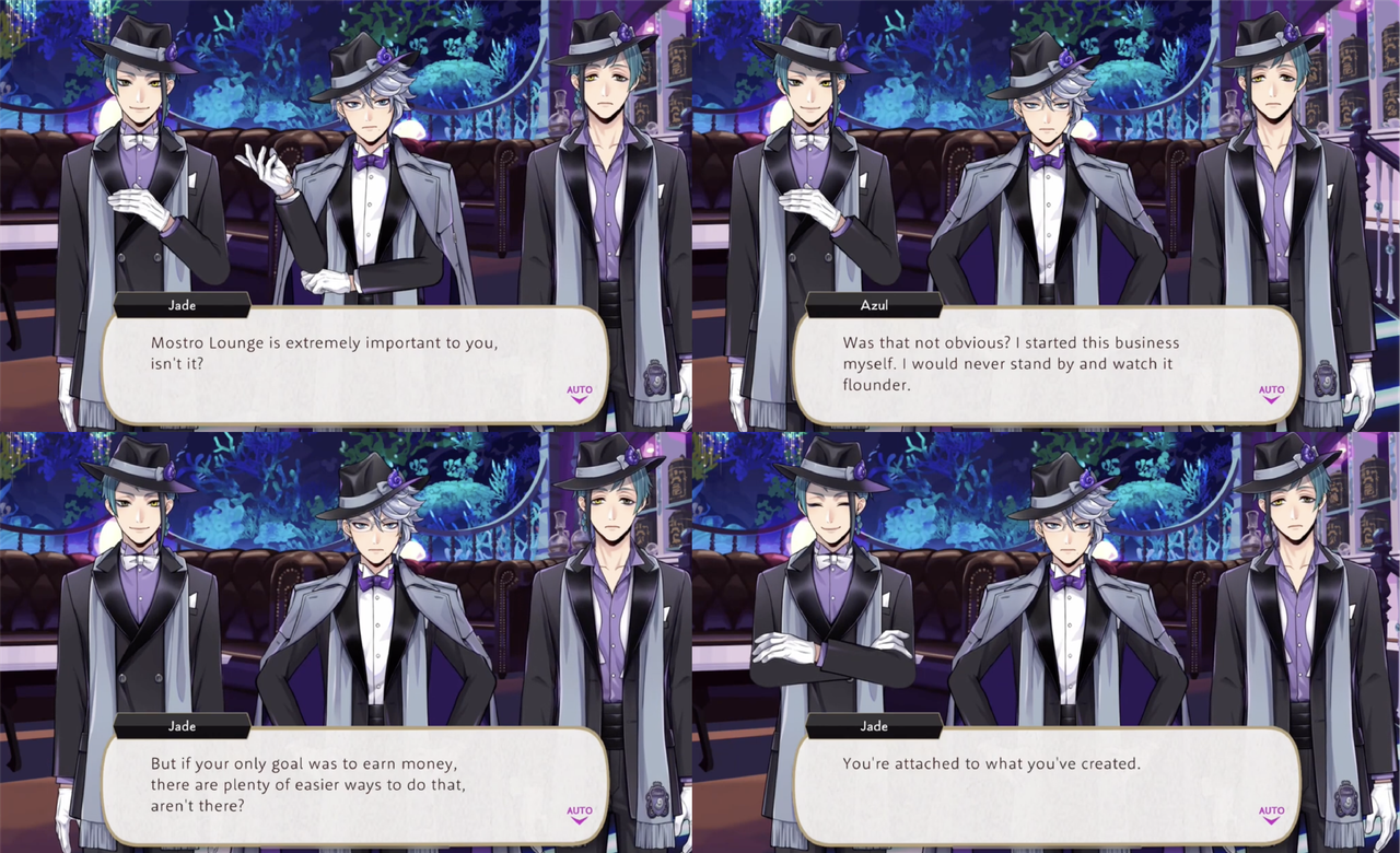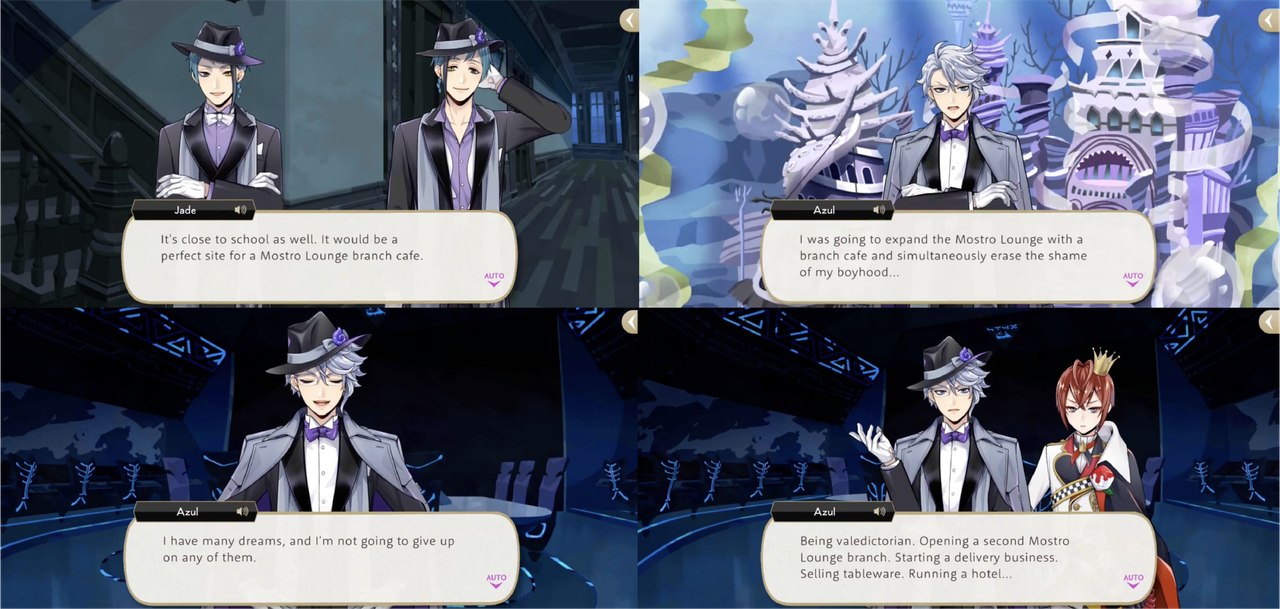 Azul seems taken aback by the restaurant where they meet Vil’s father, saying, “I was just taking in how…how wonderful all this is. The decorations, the staff’s uniforms, the music in the background,” and expresses interest in introducing one of their drinks at Mostro Lounge.