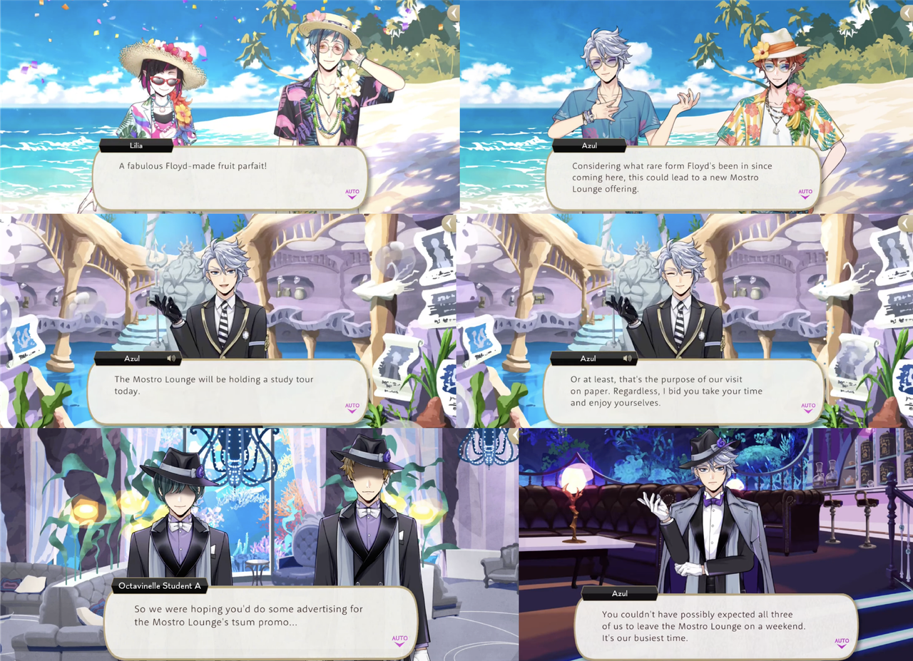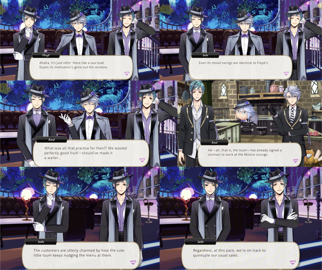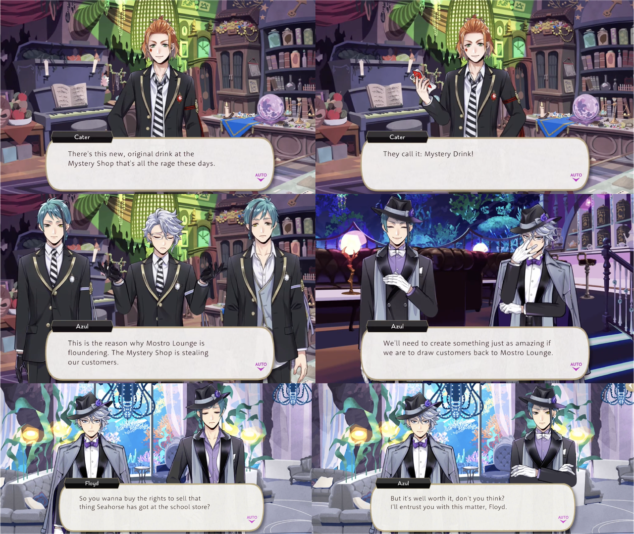 Azul’s, Jade’s and Floyd’s dorm uniform vignettes all revolves around Mostro Lounge: Azul reveals that they are losing customers to the school store after Sam launches a “Mystery Drink” with which the lounge cannot compete. Azul assigns Floyd to the task of buying the rights to sell the drink in the lounge from Sam. After going on an unrelated side-adventure Floyd ends up with Riddle’s alchemy notebook, which he gives to Jamil, who needs it to do Kalim’s homework. In exchange Kalim gives Floyd “a legendary jewel from the Land of Scalding Sands,” which he trades to Sam in exchange for the rights to the drink.