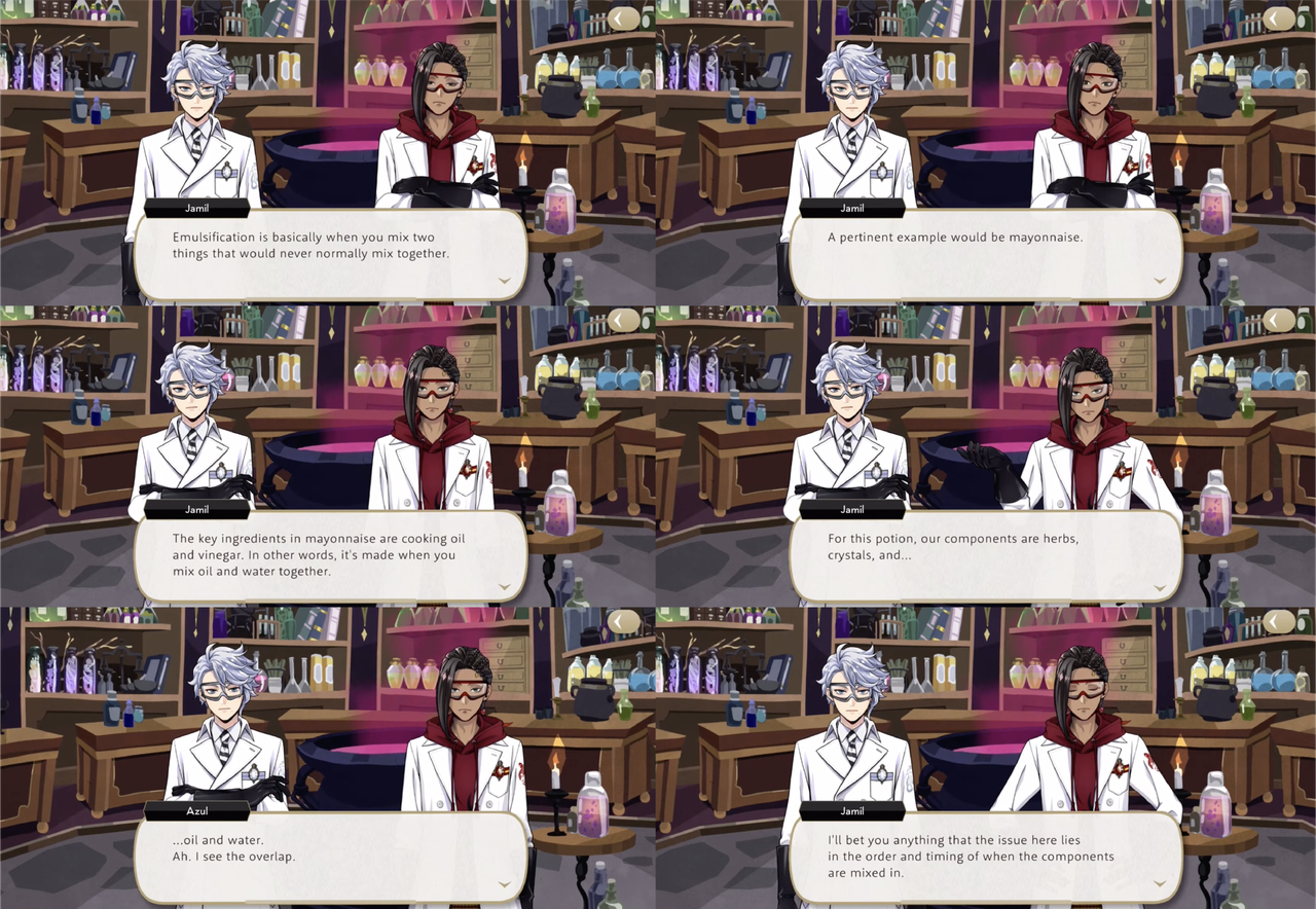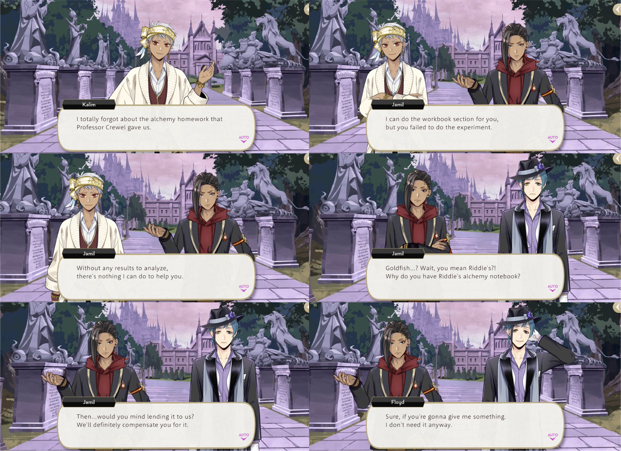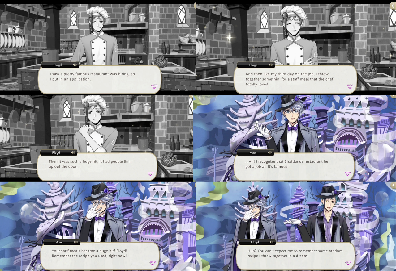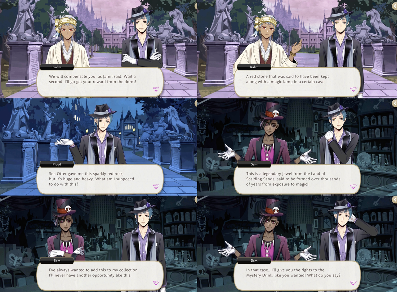 Azul’s, Jade’s and Floyd’s dorm uniform vignettes all revolves around Mostro Lounge: Azul reveals that they are losing customers to the school store after Sam launches a “Mystery Drink” with which the lounge cannot compete. Azul assigns Floyd to the task of buying the rights to sell the drink in the lounge from Sam. After going on an unrelated side-adventure Floyd ends up with Riddle’s alchemy notebook, which he gives to Jamil, who needs it to do Kalim’s homework. In exchange Kalim gives Floyd “a legendary jewel from the Land of Scalding Sands,” which he trades to Sam in exchange for the rights to the drink.