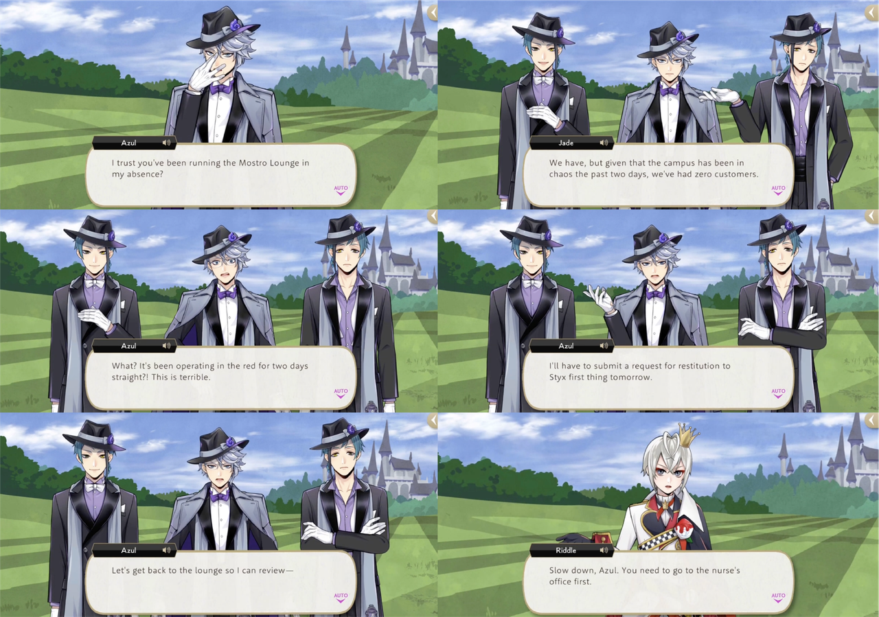 Upon returning from STYX in Book 6 Azul immediately confirms with Jade and Floyd that they have been running Mostro Lounge in his absence. When Jade reveals that they have had zero customers due to the chaos on campus Azul says, “I’ll have to submit a request for restitution to Styx first thing tomorrow” and declares that he will going to the lounge immediately, rather than the school nurse, despite having only recently descended into Tartarus and contributed to an overblotted Idia’s defeat.