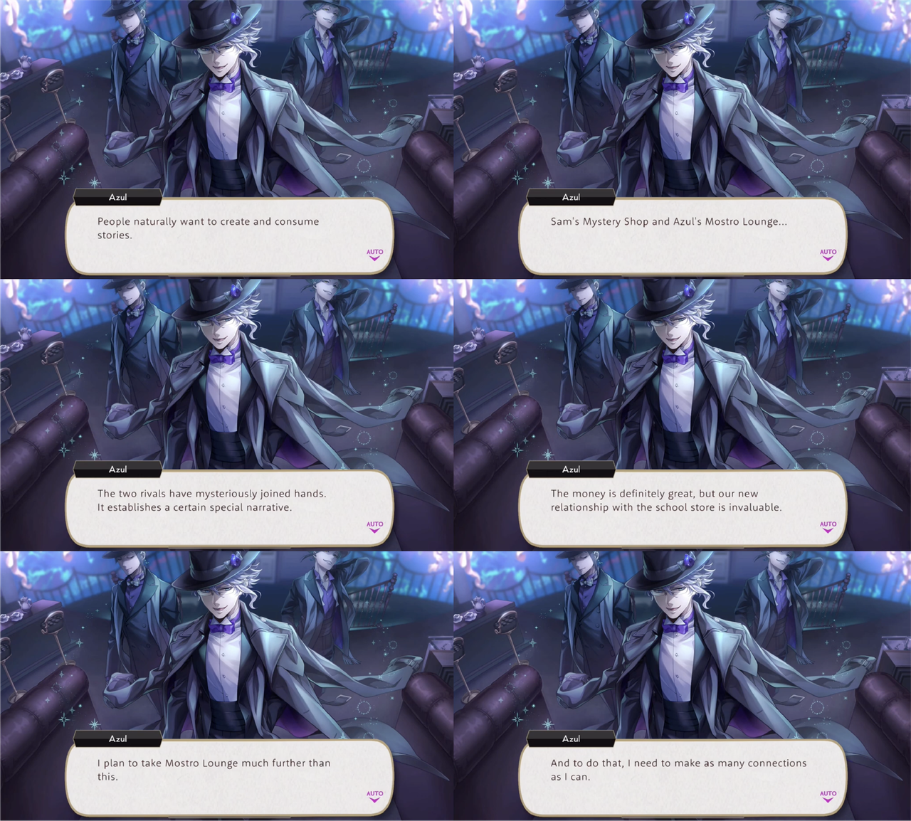 Azul explains, “People naturally want to create and consume stories. Sam’s Mystery Shop and Azul’s Mostro Lounge…the two rivals have mysteriously joined hands. It establishes a certain special narrative. The money is definitely great, but our new relationship with the school store is invaluable. I plan to take Mostro Lounge much further than this. And to do that, I need to make as many connections as I can.”