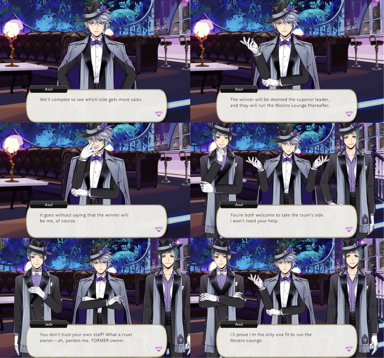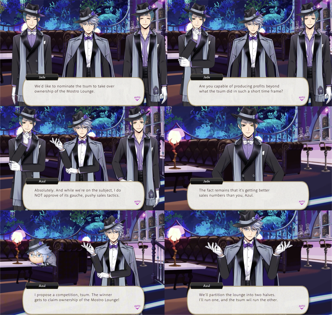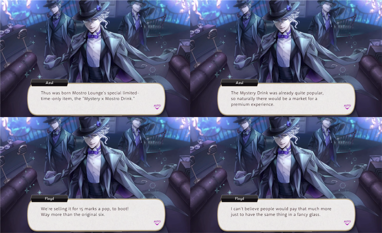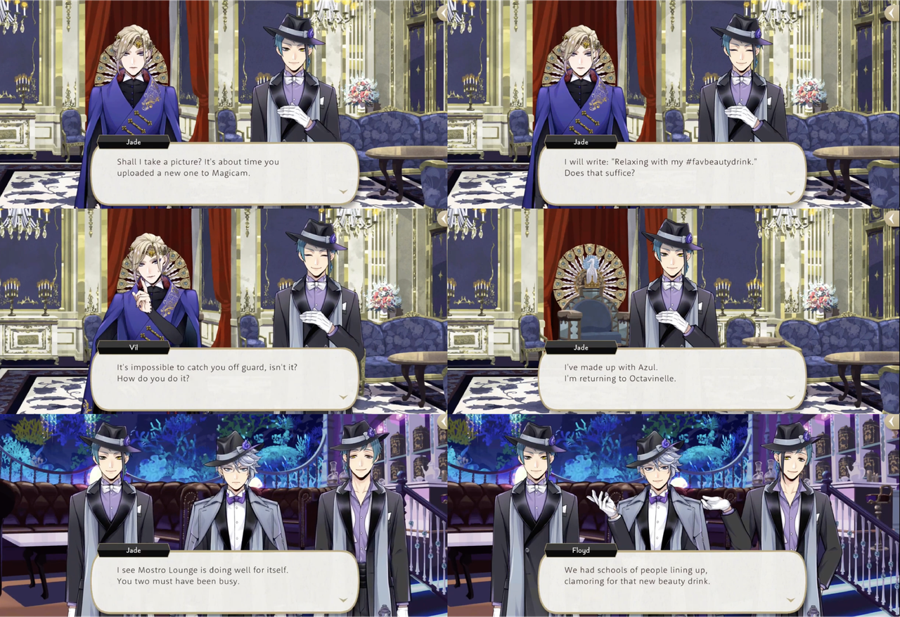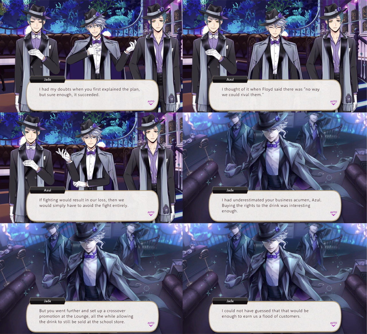 Later, Azul reveals plan was inspired by Floyd saying that Mostro Lounge could never rival Sam’s Mystery Shop: “If fighting would result in our loss, then we would simply have to avoid the fight entirely.” Jade says he had underestimated Azul’s business acumen: “Buying the rights to the drink was interesting enough. But you went further and set up a crossover promotion at the Lounge, all the while allowing the drink to still be sold at the school store. I could not have guessed that that would be enough to earn us a flood of customers.”