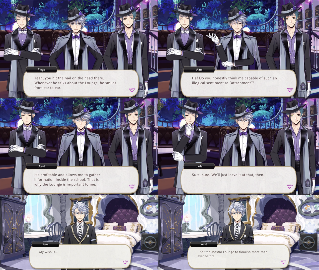 Despite saying that the lounge is all he thinks about, however, when Jade says that Azul is attached to the lounge, Azul denies it: “Do you honestly think me capable of such an illogical sentiment as ‘attachment?’ It’s profitable and allows me to gather information inside the school. That is why the Lounge is important to me.” Jade is unconvinced.
