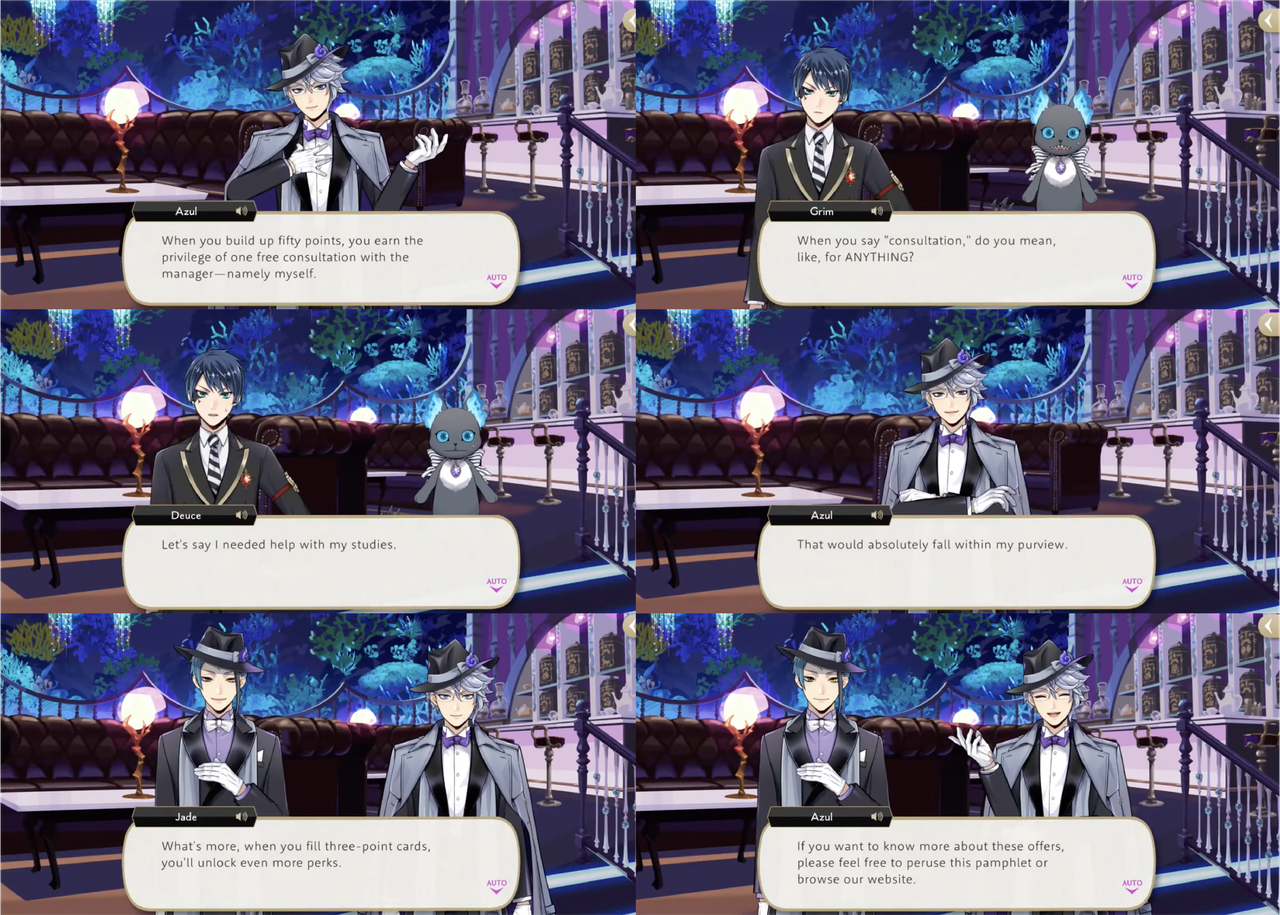 At the conclusion of Book 3 Azul invites members of the group that instigated his overblot to an unusually crowded Mostro Lounge. Floyd explains, “After everything that went down, the headmage chewed us out and said not to take anybody’s powers again, even under contract. So Azul devised a point card system!”