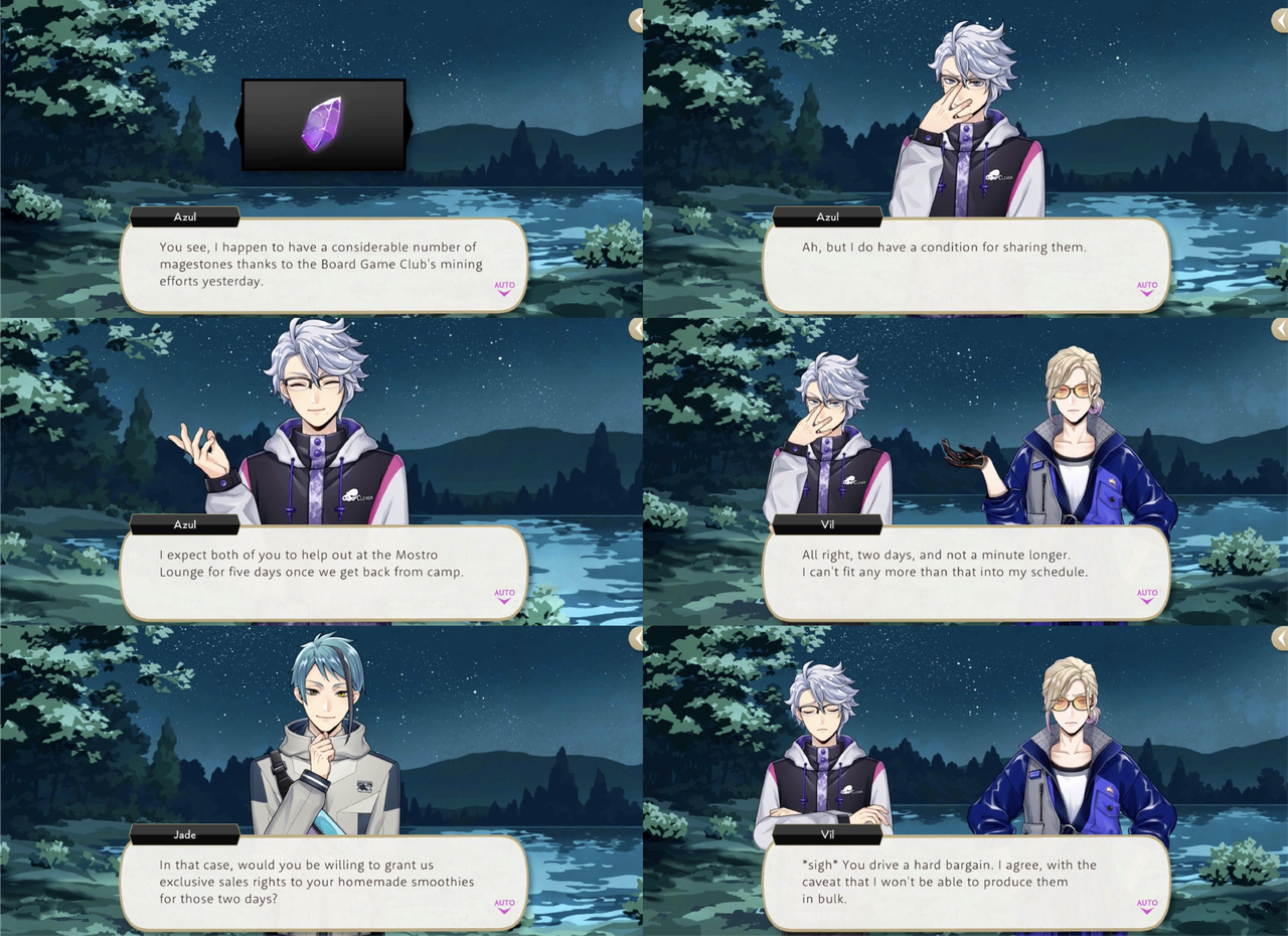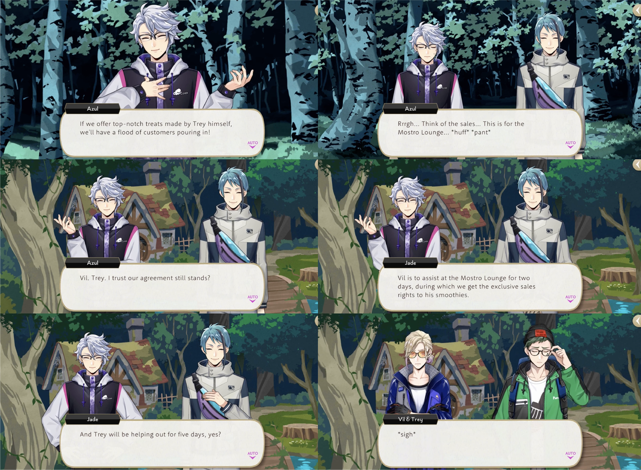 It is possible that Vil and Trey both took part in limited-time promotions at Mostro Lounge: during Vargas Camp Azul allows for the use of magestones in his possession in the fight against the Vargas Monster in exchange for two days of Vil making and selling his original-recipe smoothies at the lounge, and five days of Trey baking confectionaries.