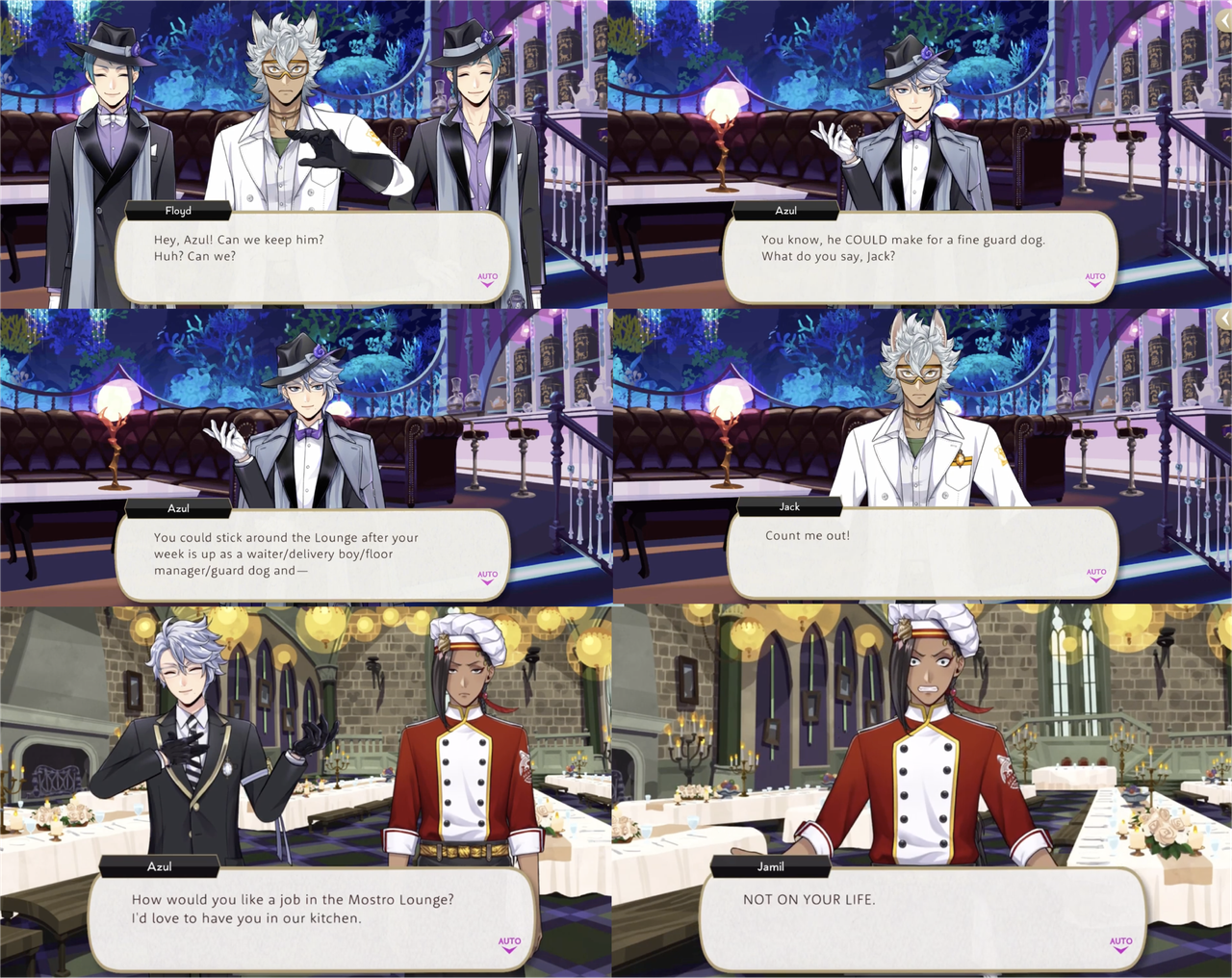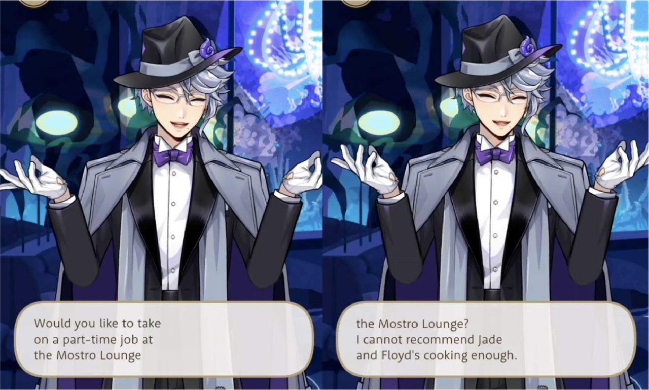 Ruggie is seen working at Mostro Lounge both in a vignette and in the Main Story, while Jack also temporarily works at Mostro Lounge in a vignette where he exceeds Azul’s expectations.