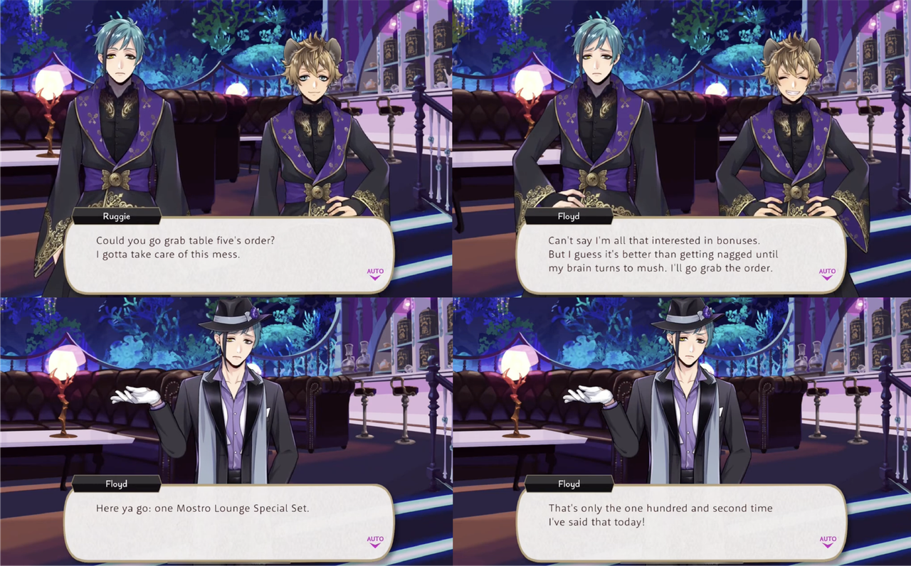 Mostro Lounge is described as “a meeting place for gentlemen,” where students are expected to abide by Octavinelle rules. No fighting of any kind is permitted, and there is one-drink minimum.