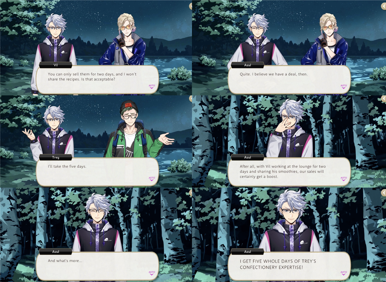 Azul observes, “With Vil working at the lounge for two days and sharing his smoothies, our sales will certainly get a boost,” and, “If we offer top-notch treats made by Trey himself, we’ll have a flood of customers pouring in!”