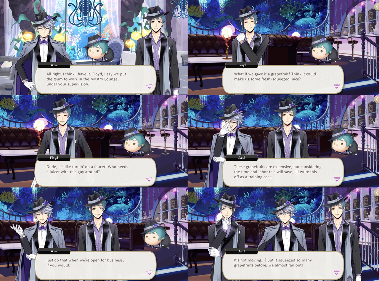 During the Tsumsted event Azul decides to put Floyd’s tsum to work at Mostro Lounge, and the tsum seems to enjoy squeezing grapefruit for drinks. After the lounge actually opens for business, however, the tsum changes its mind. (Azul: “We wasted perfectly good fruit! I should’ve made it a waiter…”)