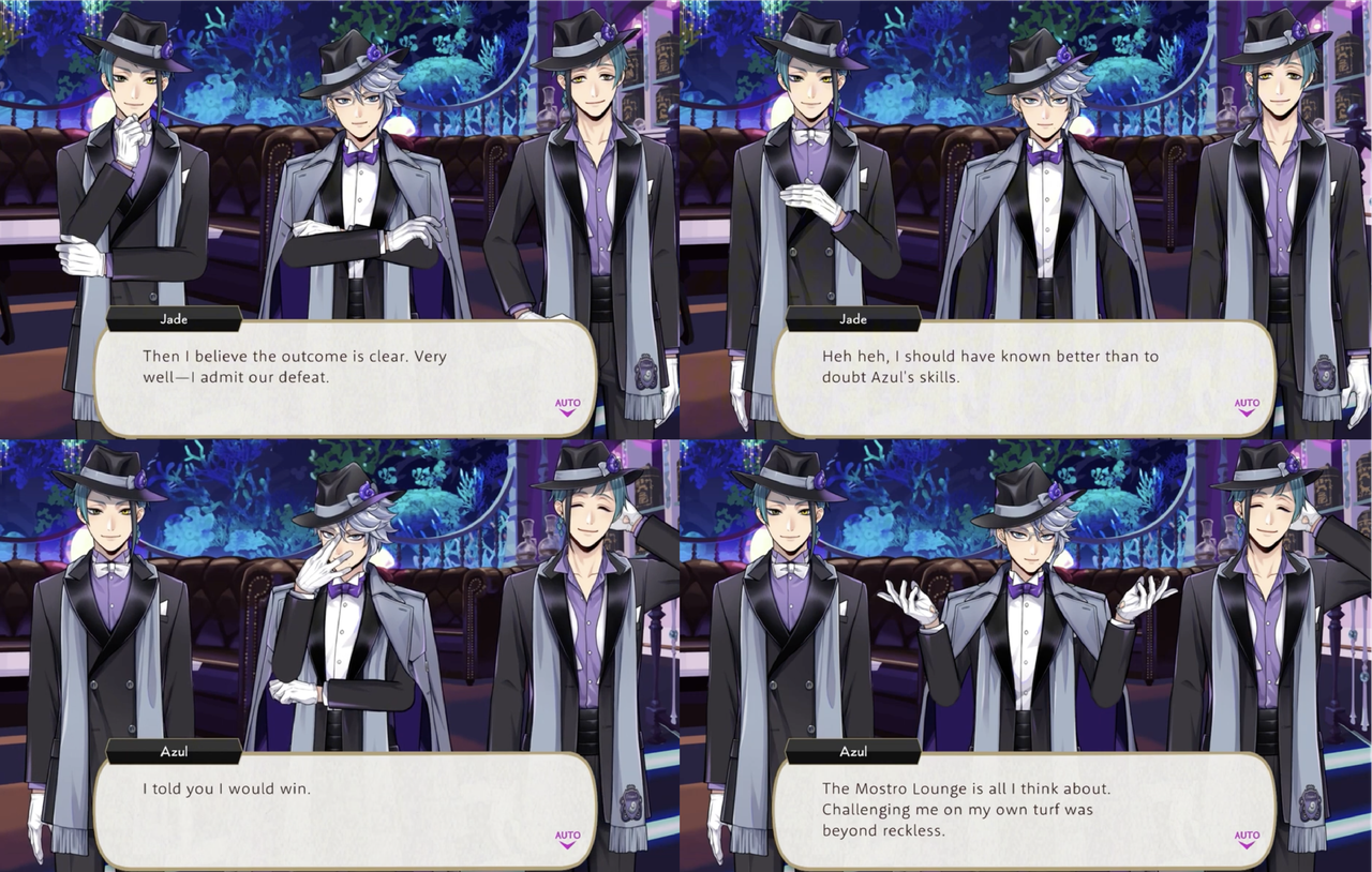 Jade concedes defeat, saying, “I should have known better than to doubt Azul’s skills,” and Azul responds, “The Mostro Lounge is all I think about. Challenging me on my own turf was beyond reckless.”