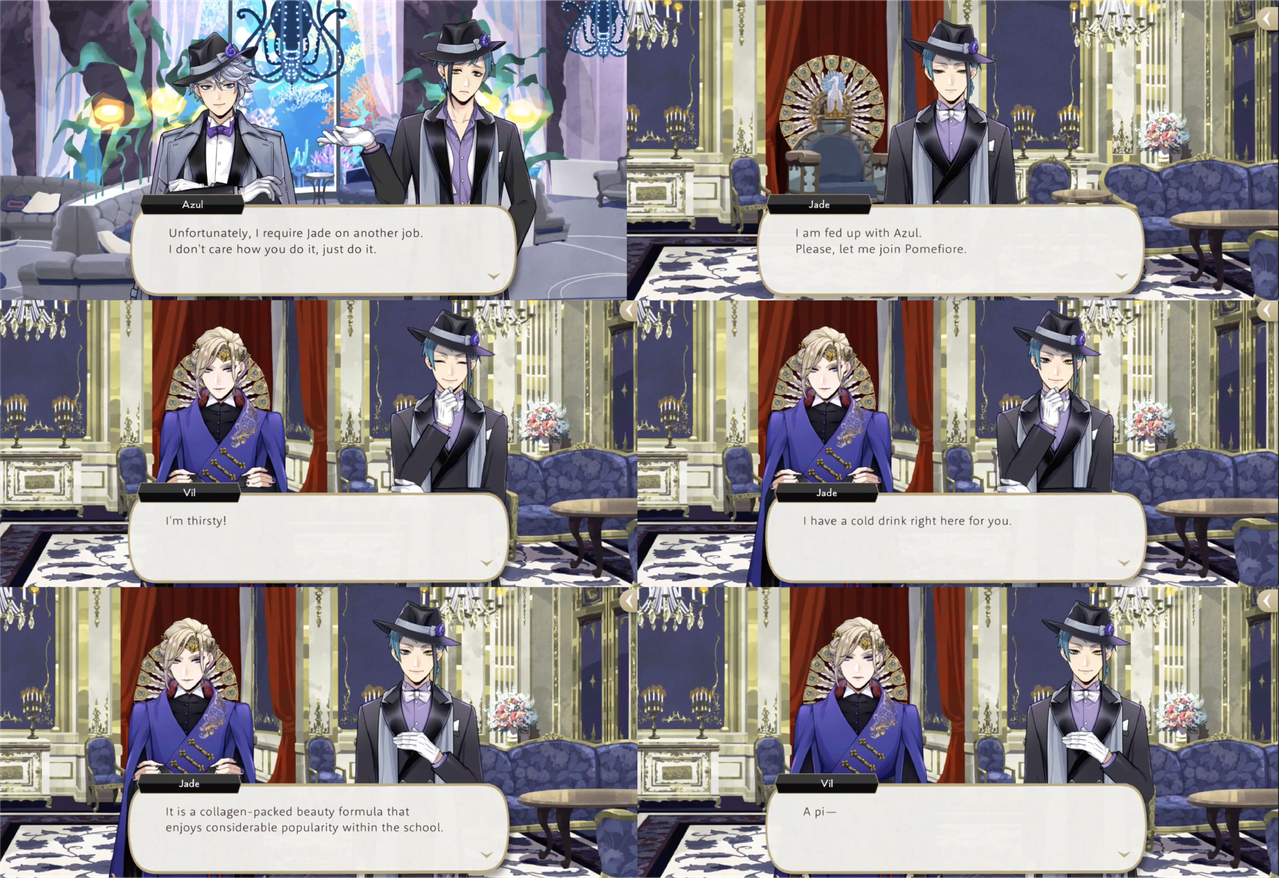 Jade’s task involves him temporarily transferring to Pomefiore, becoming an assistant to Vi and having Vil promote the drink on Magicam without realizing that he does it, thus gaining them free advertising for the lounger.