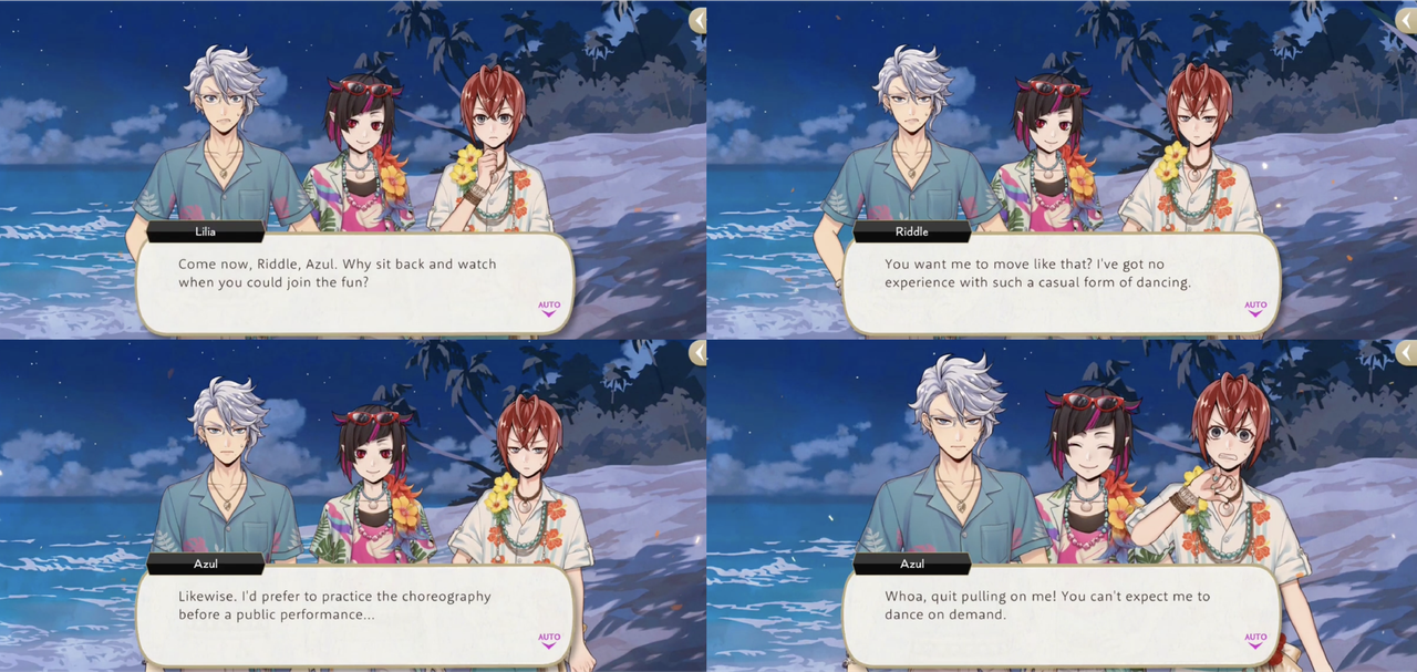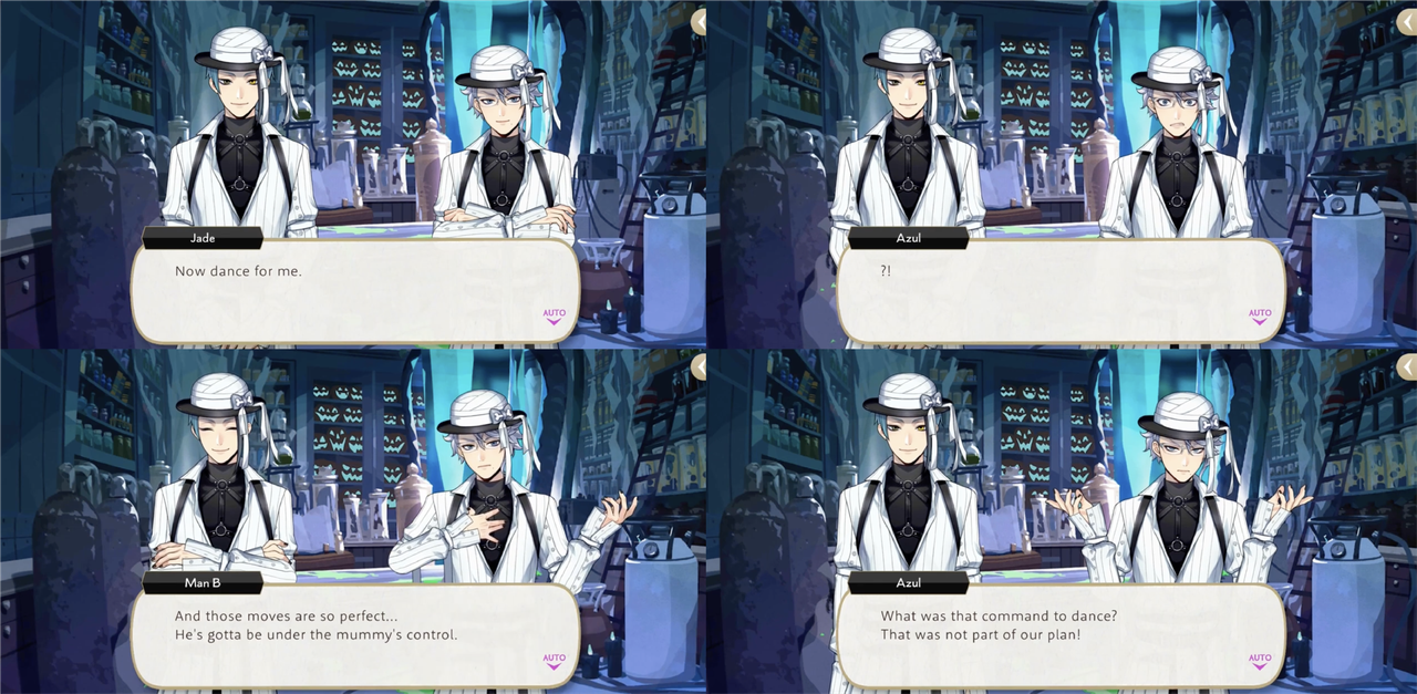 Azul is not pleased when Lilia urges him to dance during the Stitch event without any time to prepare, saying, “I’d prefer to practice the choreography before a public performance” and “You can’t expect me to dance on demand,” but that is exactly what happens during Halloween when Jade goes off script and orders Azul to dance for him (“That was not part of our plan!”).