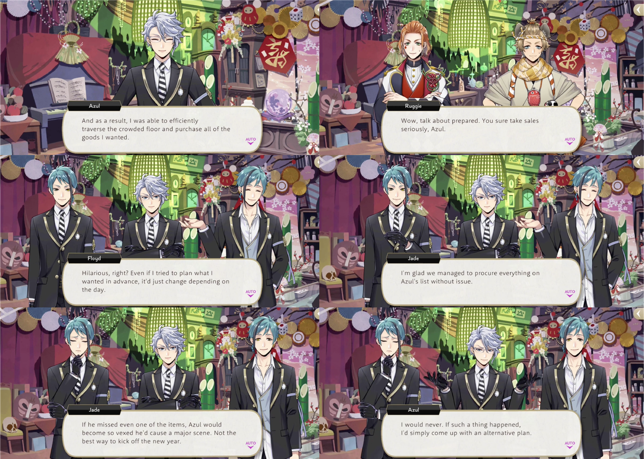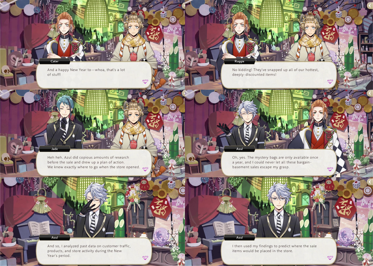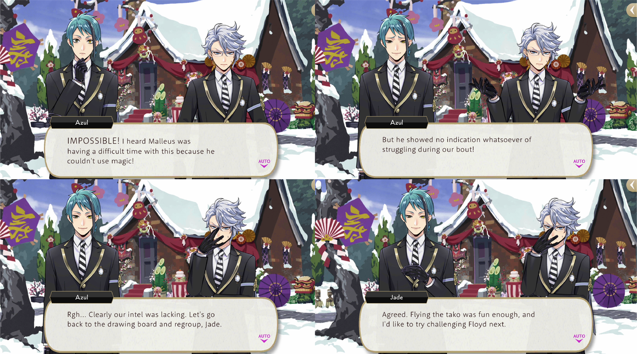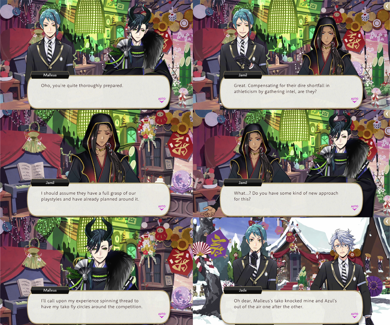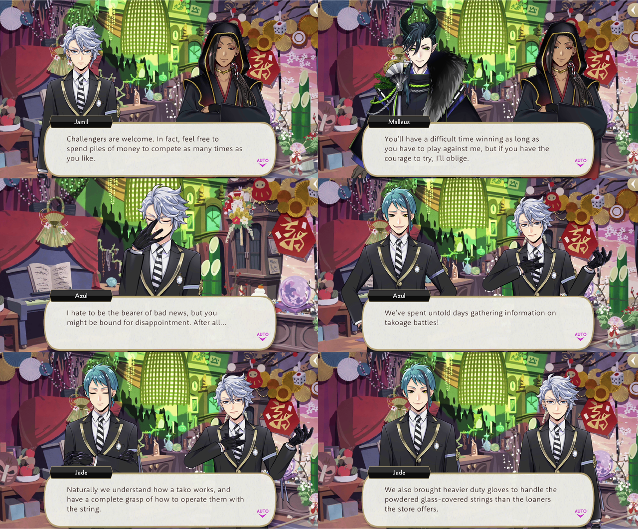 During another New Year’s Azul reveals that he has spent “untold days gathering information on takoage battles” in order to beat Malleus and Jamil at the game.” Jamil reflects, “I should assume they have a full grasp of our playstyles and have already planned around it,” which Malleus counters by attempting a new approach, and succeeds.