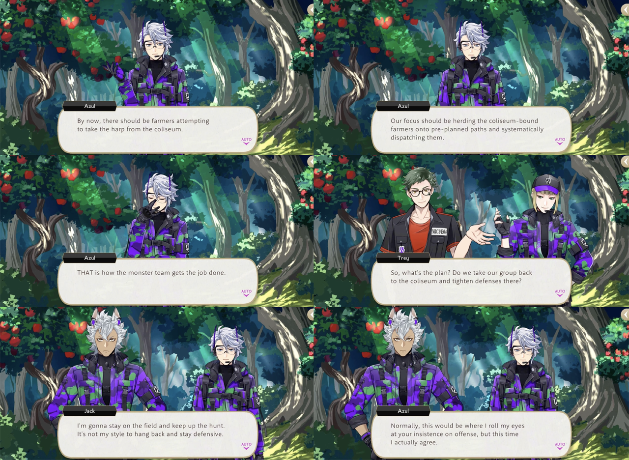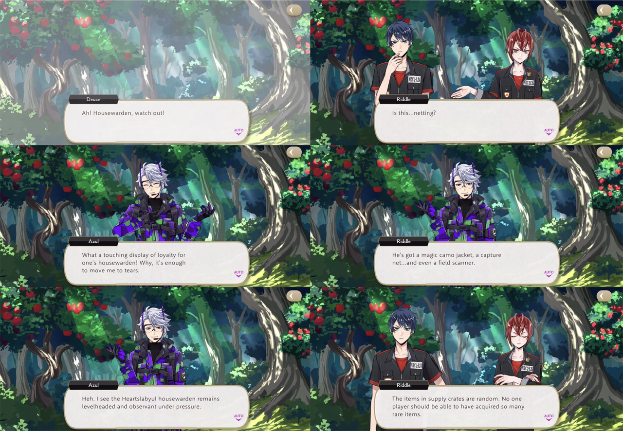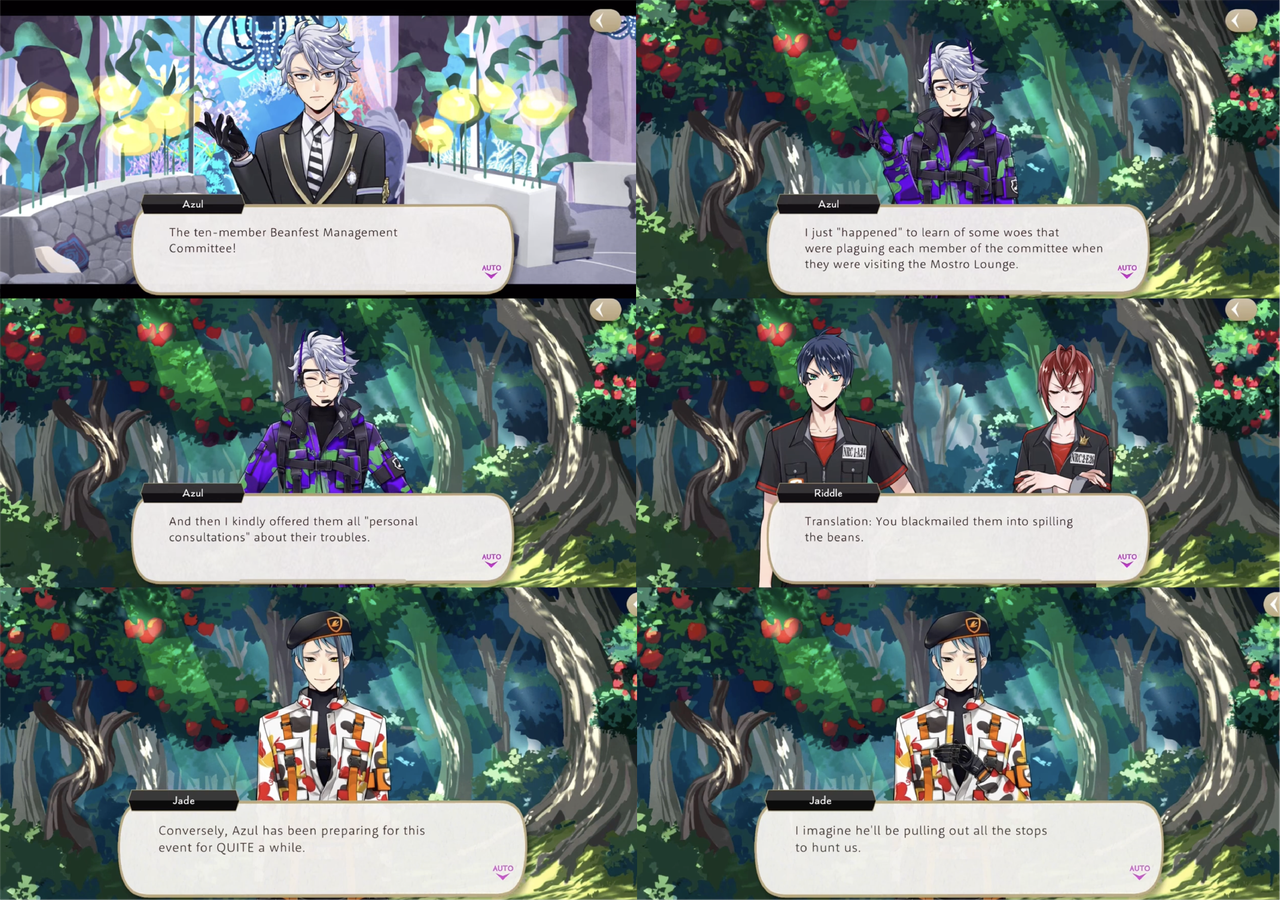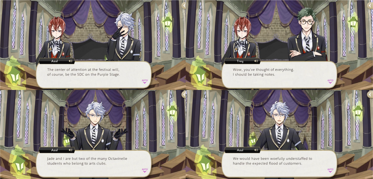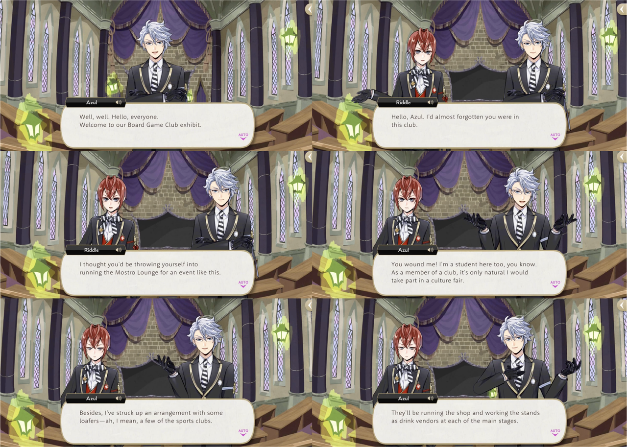 Riddle is surprised to find Azul representing the boardgame club during NRC’s culture fair rather than running Mostro Lounge, and Azul reveals he has planned for the day in advance, hiring sports club members to run the lounge and sell drinks at the event’s main stages (Trey: “Wow, you’ve thought of everything. I should be taking notes”).