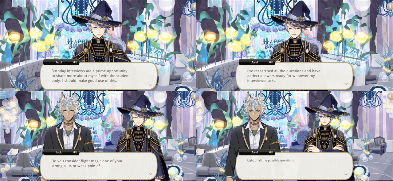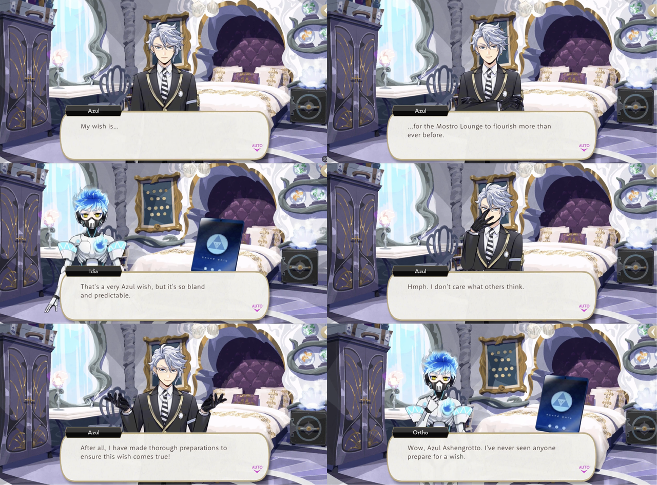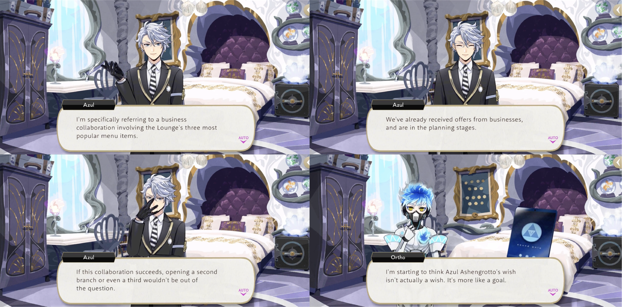 Azul’s wish for the Wish Upon a Star event is for Mostro Lounge to flourish, but he explains that he has actually already made “thorough preparations to ensure this wish comes true” (Idia: “I’ve never seen anyone prepare for a wish”), planning a collaboration that he hopes will result in a second “or even a third” branch.