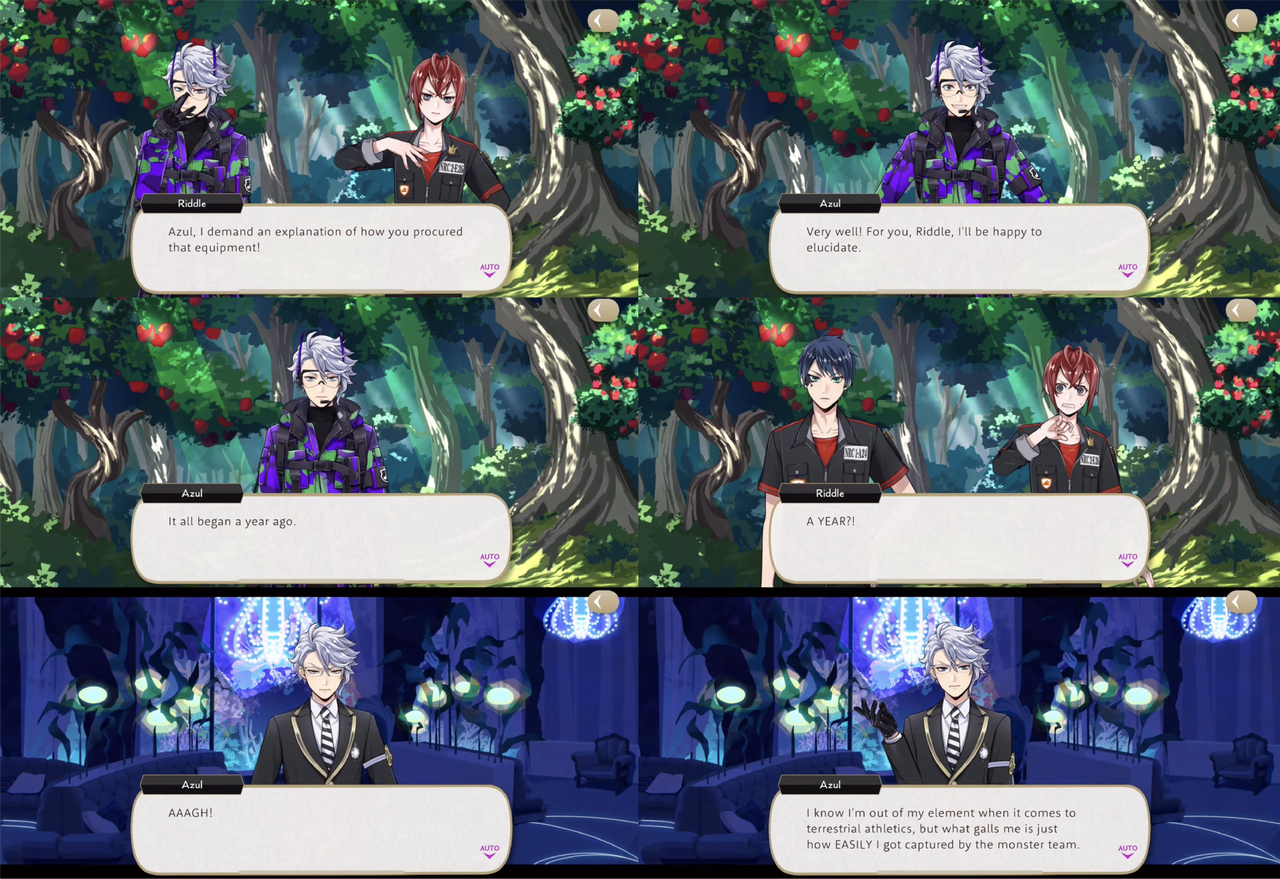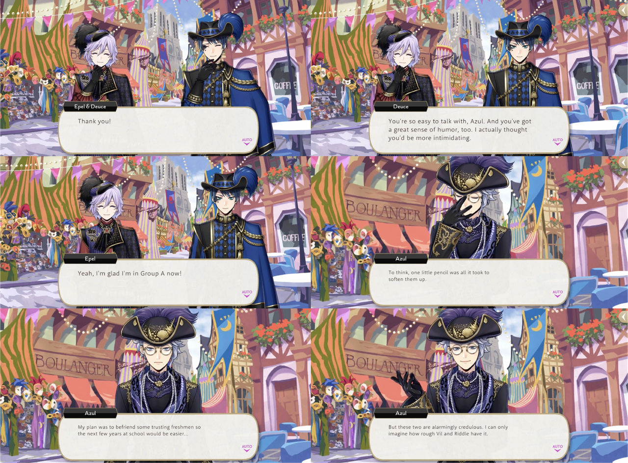 The two first-year students are delighted and Azul quietly reflects, “My plan was to befriend some trusting freshmen so the next few years at school would be easier, but these two are alarmingly credulous. I can only imagine how rough Vil and Riddle have it.”