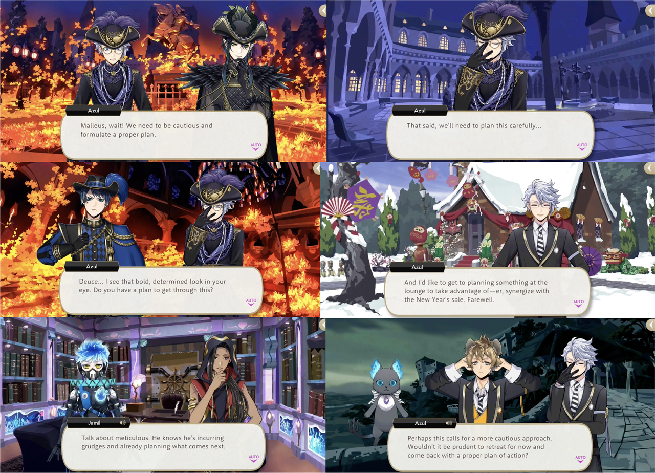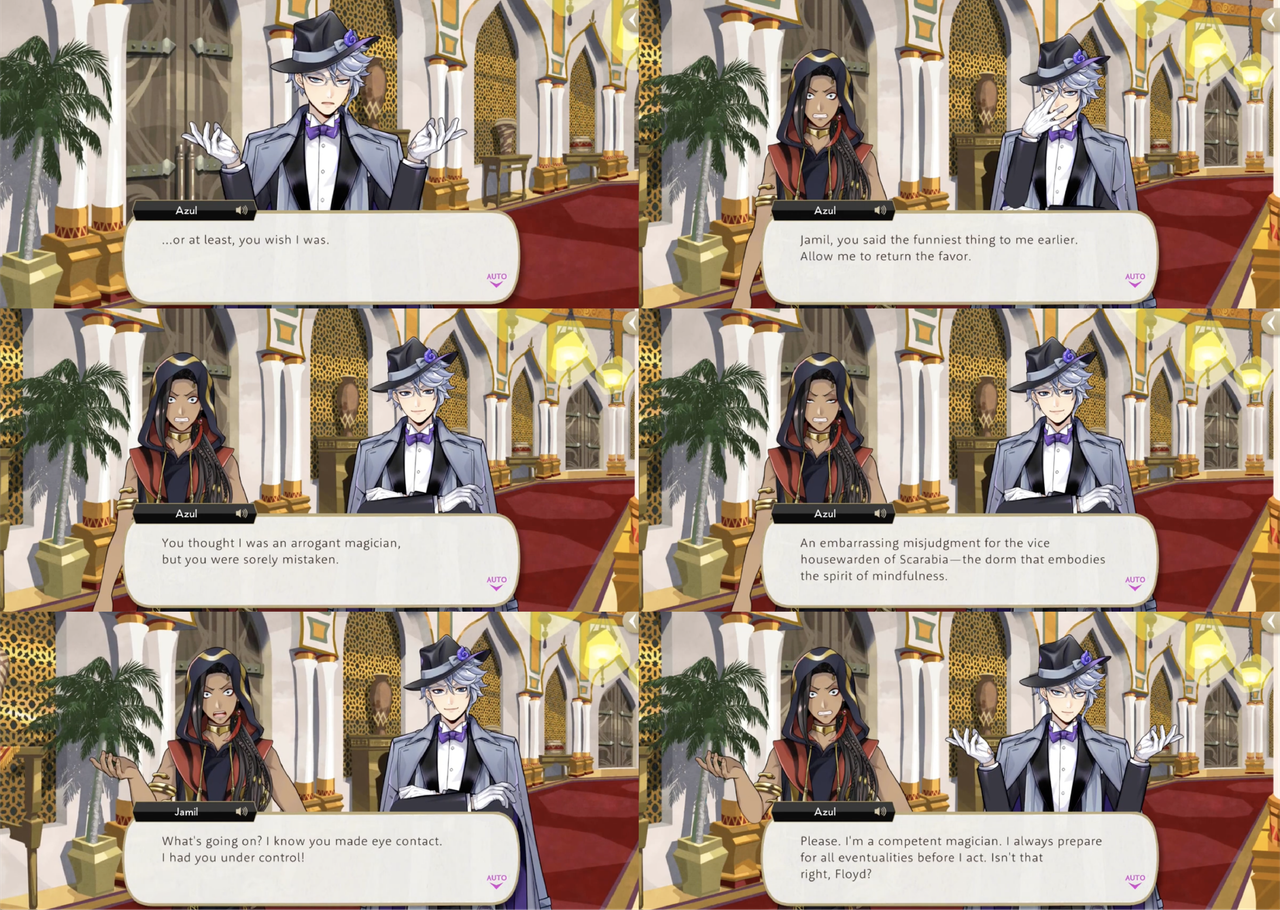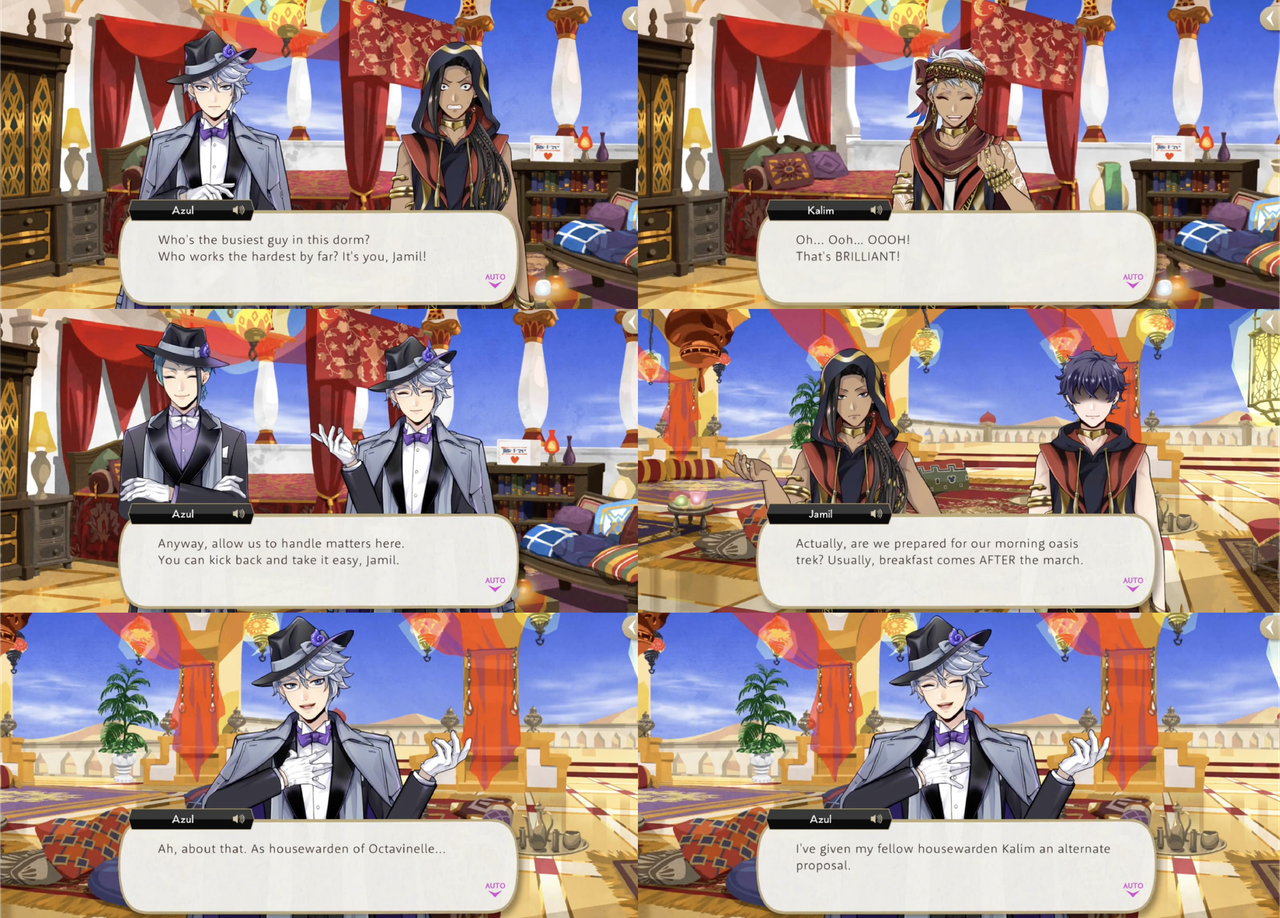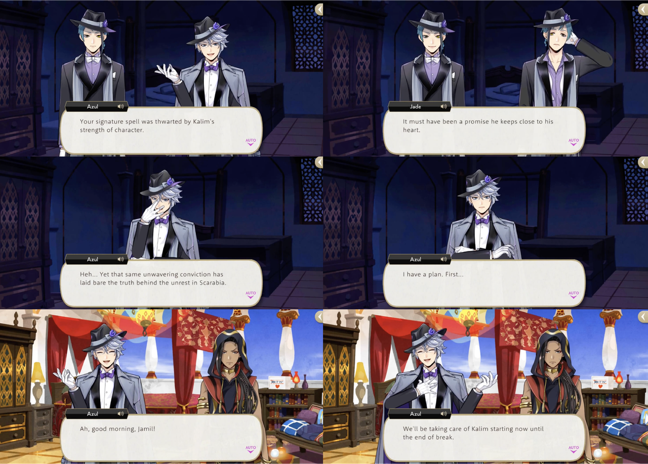 It is Azul’s plan that takes down Jamil in Book 4: using his position as Housewarden to override Jamil’s plot (“I’ve given my fellow housewarden Kalim an alternate proposal”), he improves upon the training camp that Jamil-via-Kalim had instituted, encourages a disheartened Kalim, and creates a study/practical magic/cooking curriculum that has the students of Scarabia dorm enjoying the activities that had been meant to overwhelm them into ousting Kalim from his position.