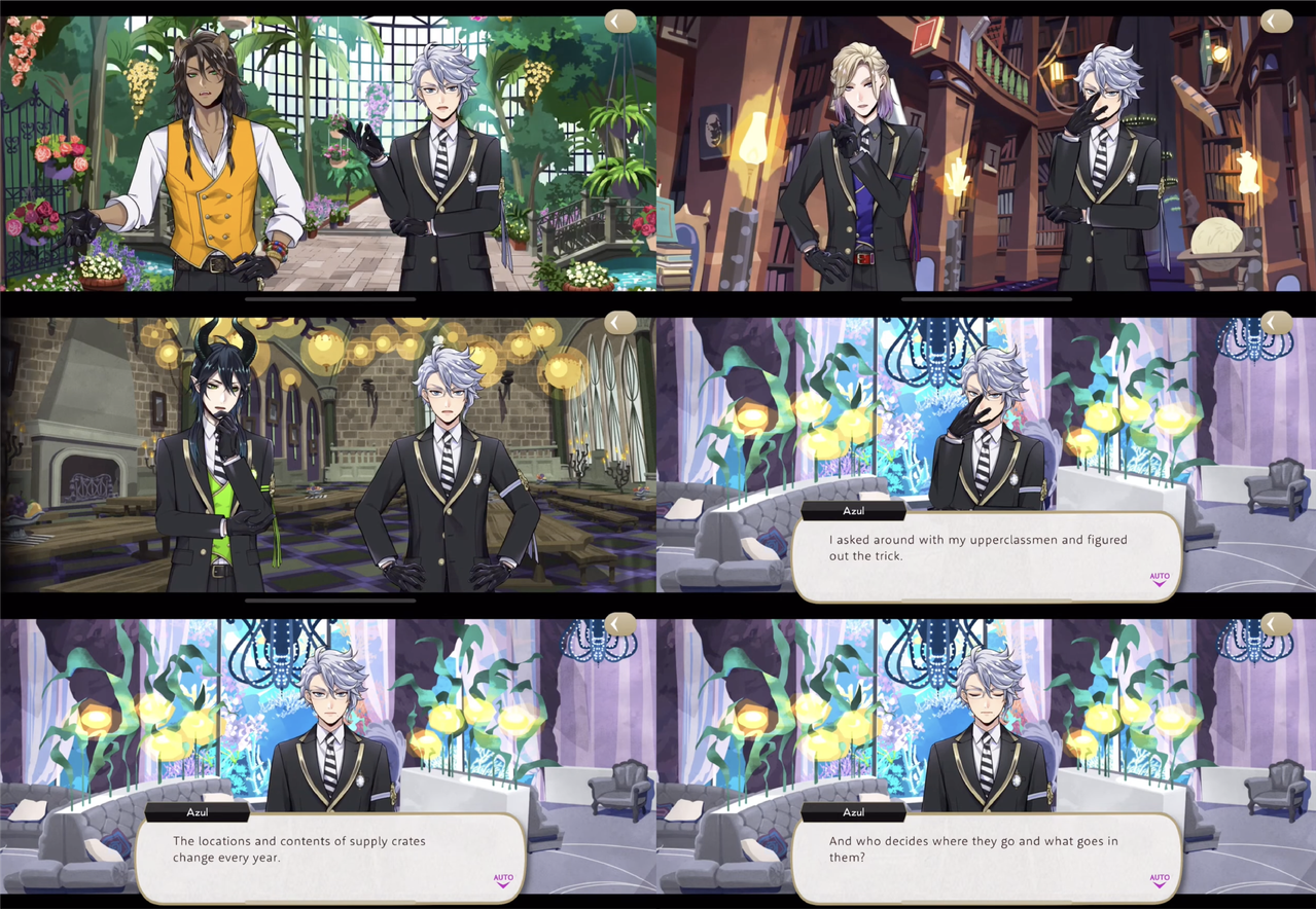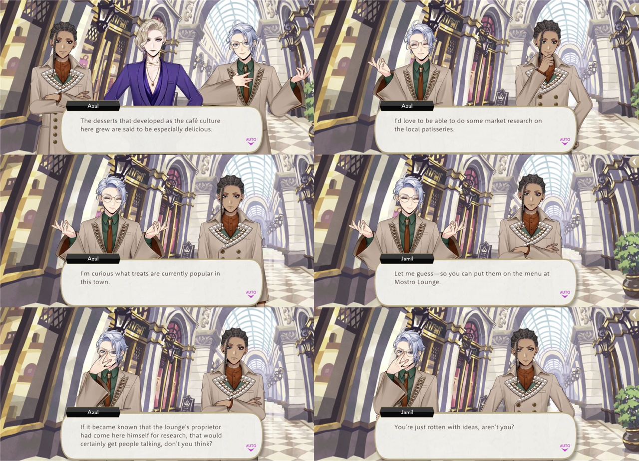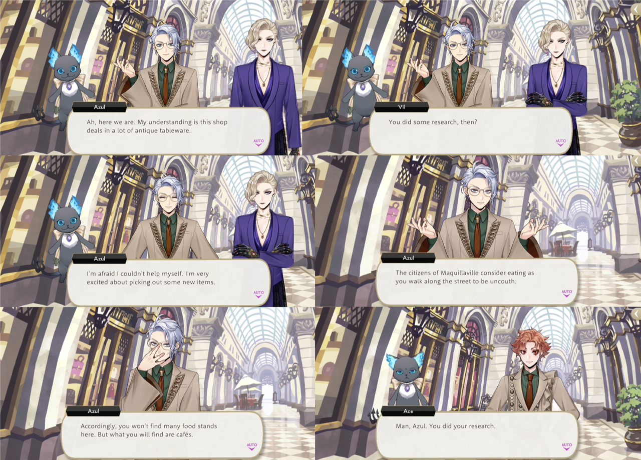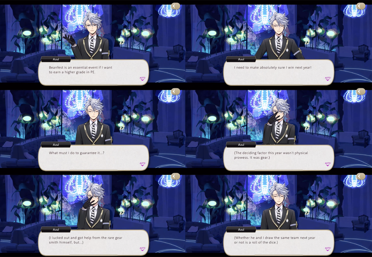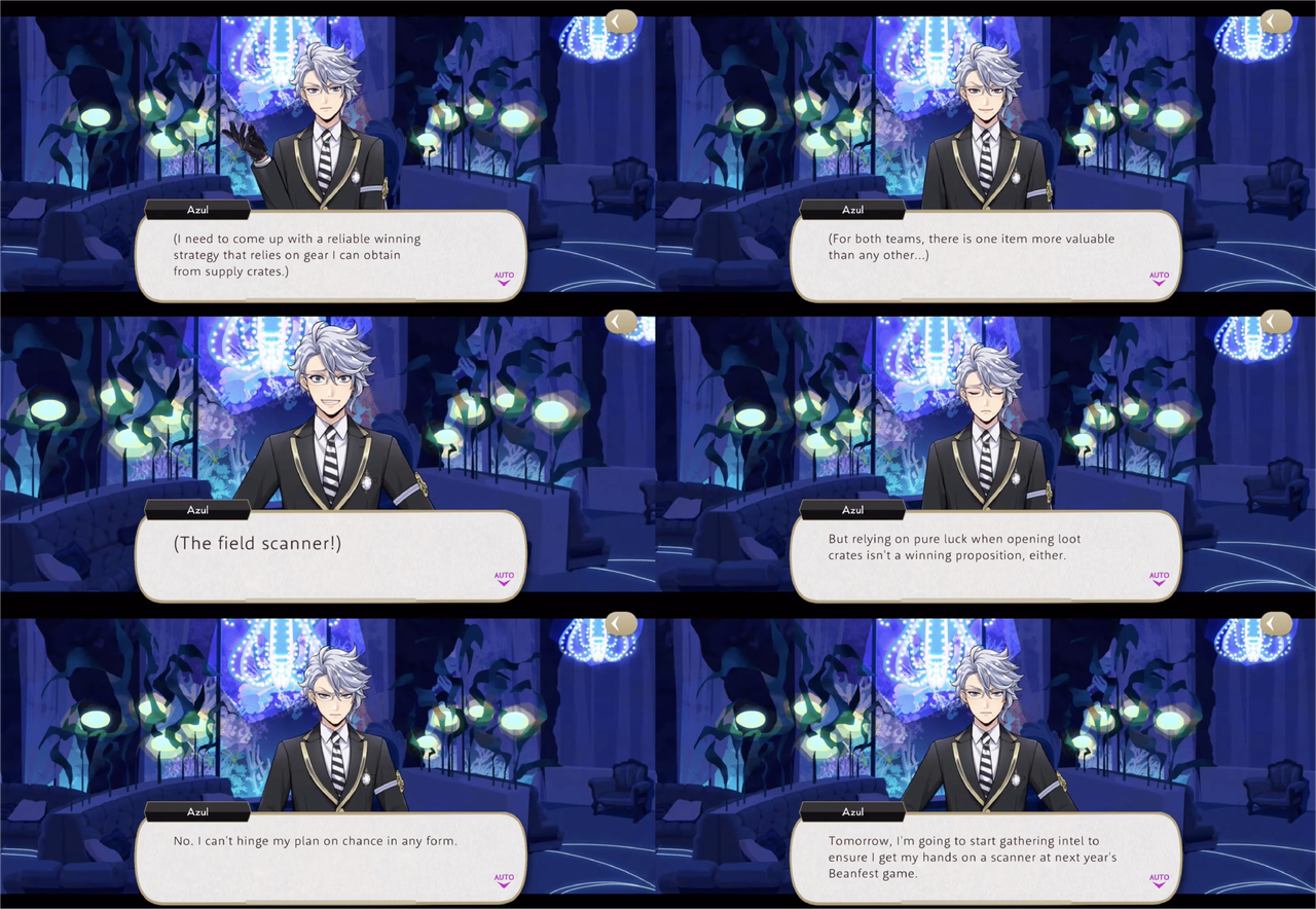 Azul also plans in advance for his visit to the Fairest City, with both Vil and Ace commenting on the amount of research he has done. He expresses an interesting in doing market research on local patisseries, and when Jamil guesses that he wants to incorporate local treats into Mostro Lounge’s menu, Azul confirms that that is the plan: “If it became known that the lounge’s proprietor had come here himself for research, that would certainly get people talking, don’t you think?”