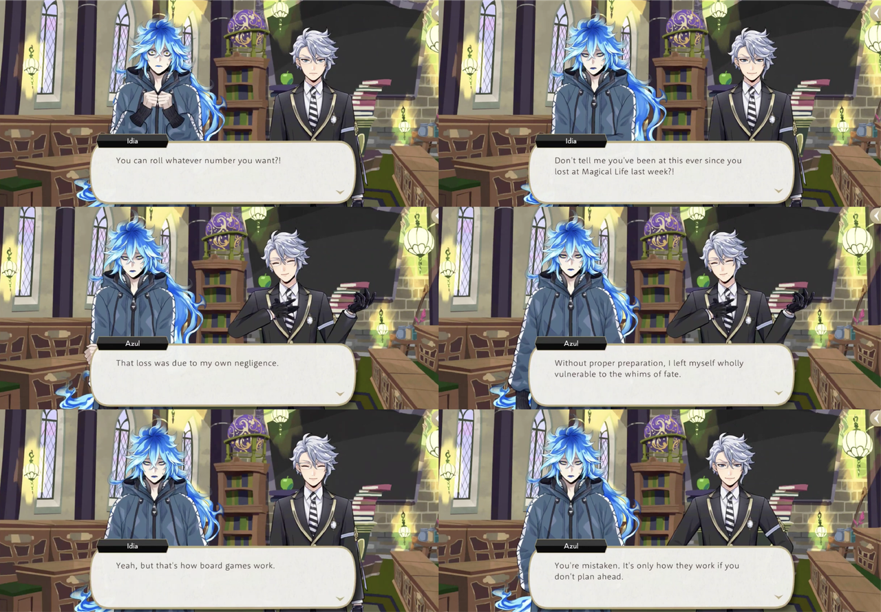 Azul explains, “That loss was due to my own negligence. Without proper preparation, I left myself wholly vulnerable to the whims of fate.” Idia says, “that’s how board games work,” and Azul responds, “It’s only how they work if you don’t plan ahead.”