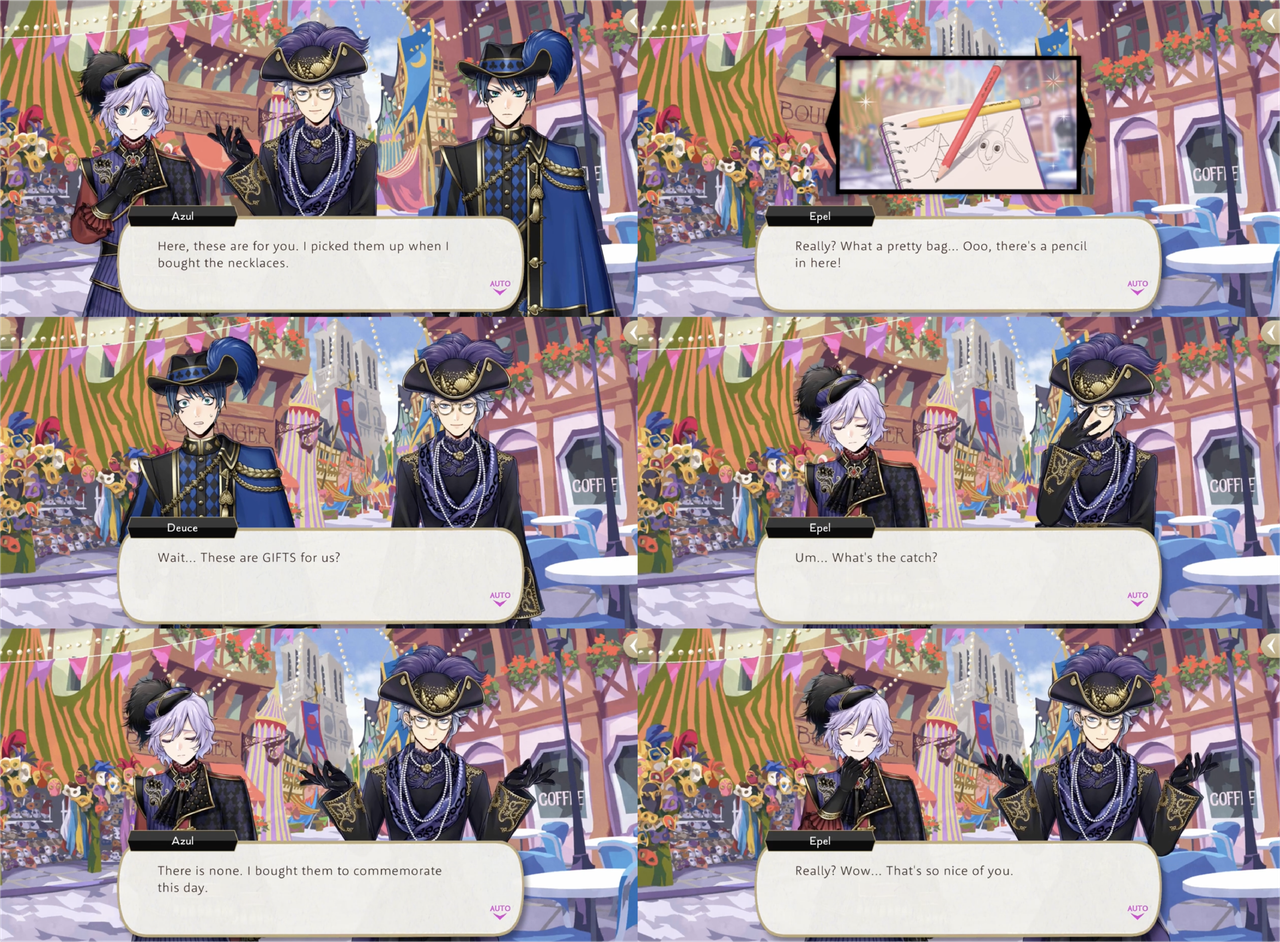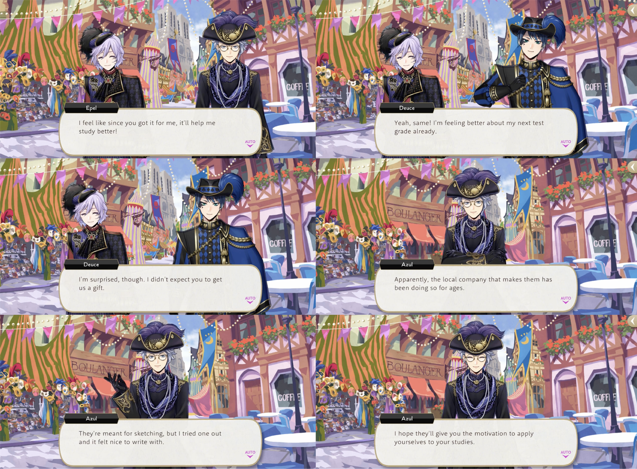 Azul also prepares in advance for Glorious Masquerade (“I did research beforehand and formulated some plans”), leading even Rollo to say, “You really have done your research.” Another plan of Azul’s comes into play when he purchases pencils as souvenirs for Deuce and Epel.