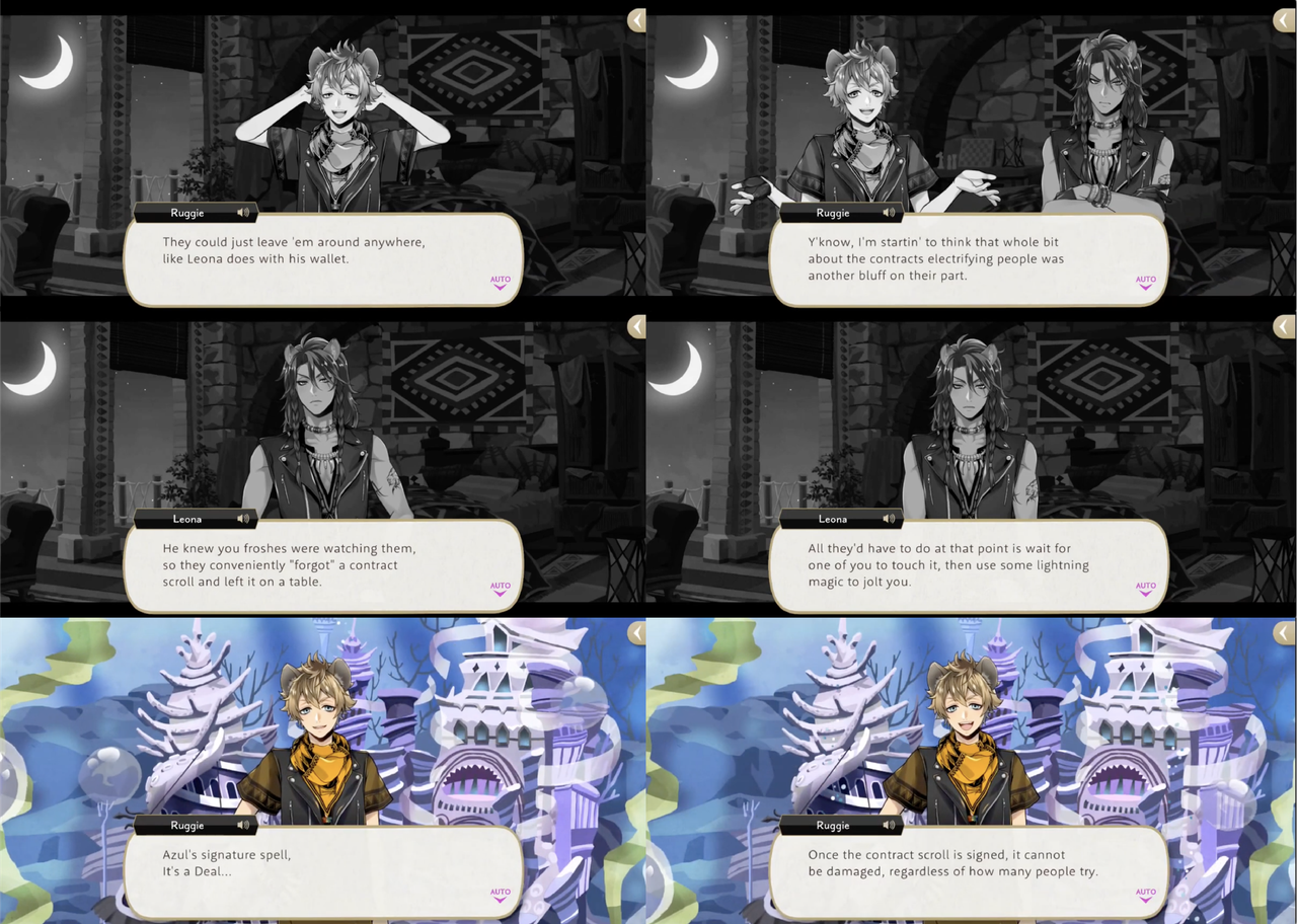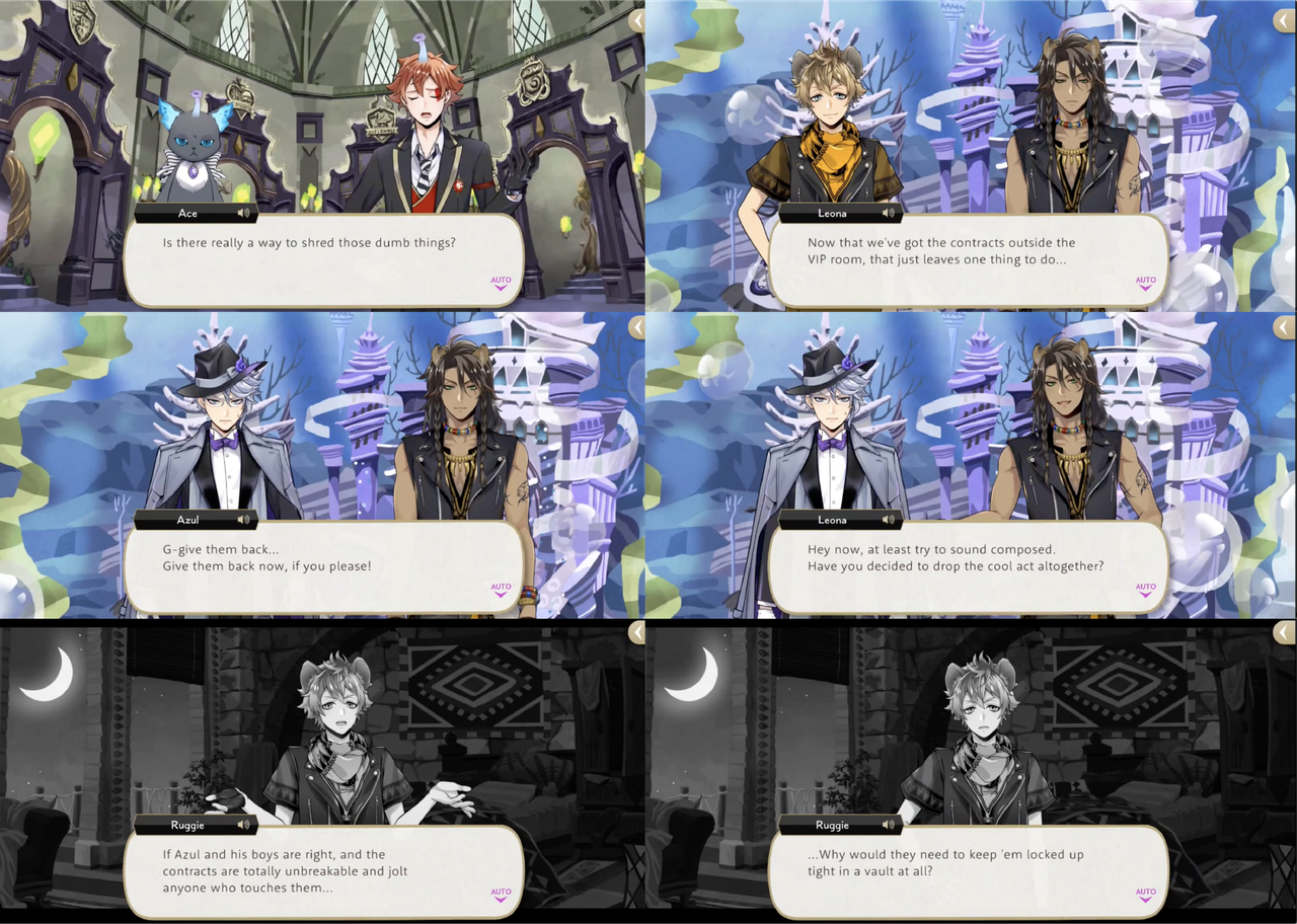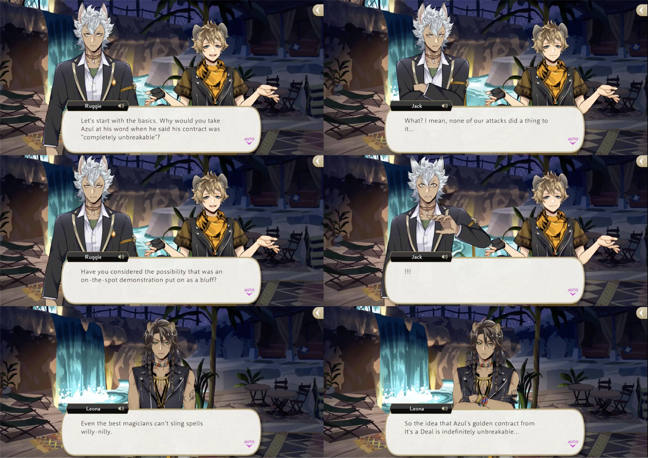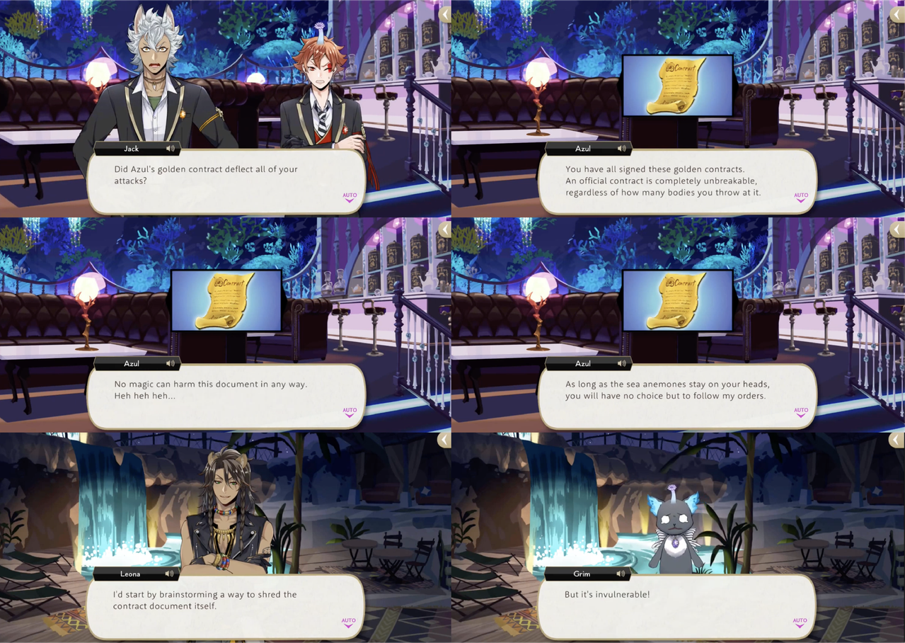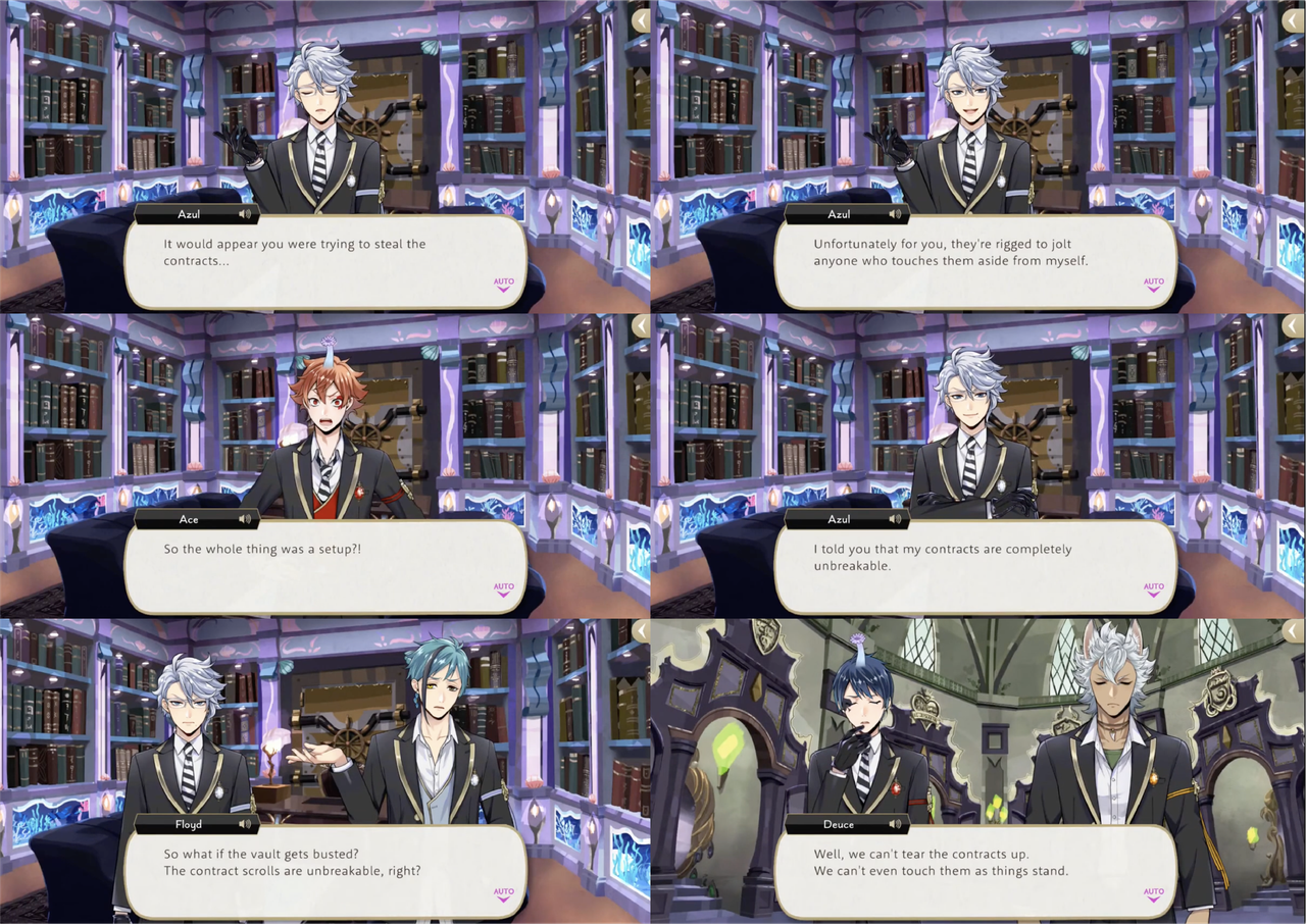 Leona’s response to hearing about the situation, however, is to shred the contracts, with Ruggie pointing out that Azul possibly provided the “on-the-spot demonstration” of “invulnerability” as a bluff. Jack’s group sneaks into Azul’s VIP room to try and destroy a contract that Azul leaves out on his desk, but it electrocutes them. Azul claims that the contracts are “rigged to jolt anyone who touches them aside from (himself),” but this is proven to be a lie: based on the logic that Azul would not need to keep the contracts in a vault if they were untouchable, Leona and Ruggie attempt and succeed at smuggling Azul’s entire collection out of Octavinelle.