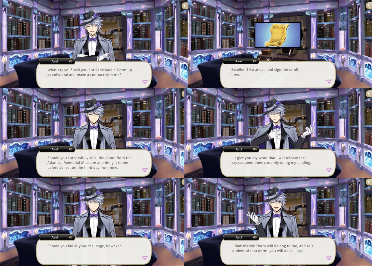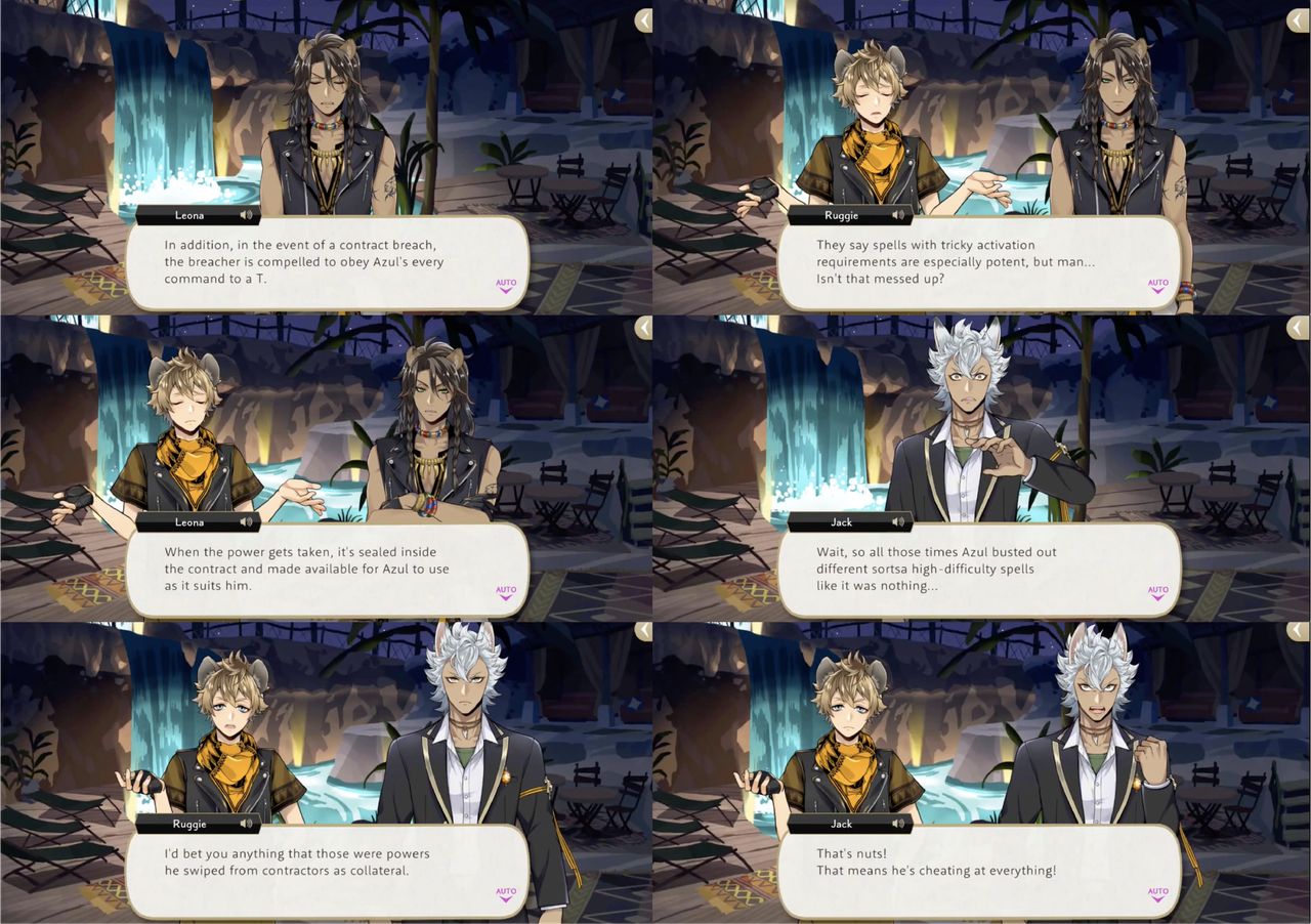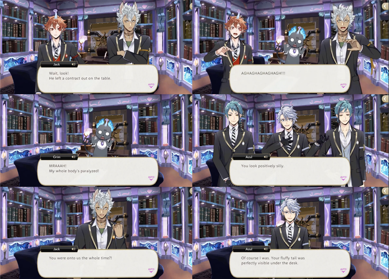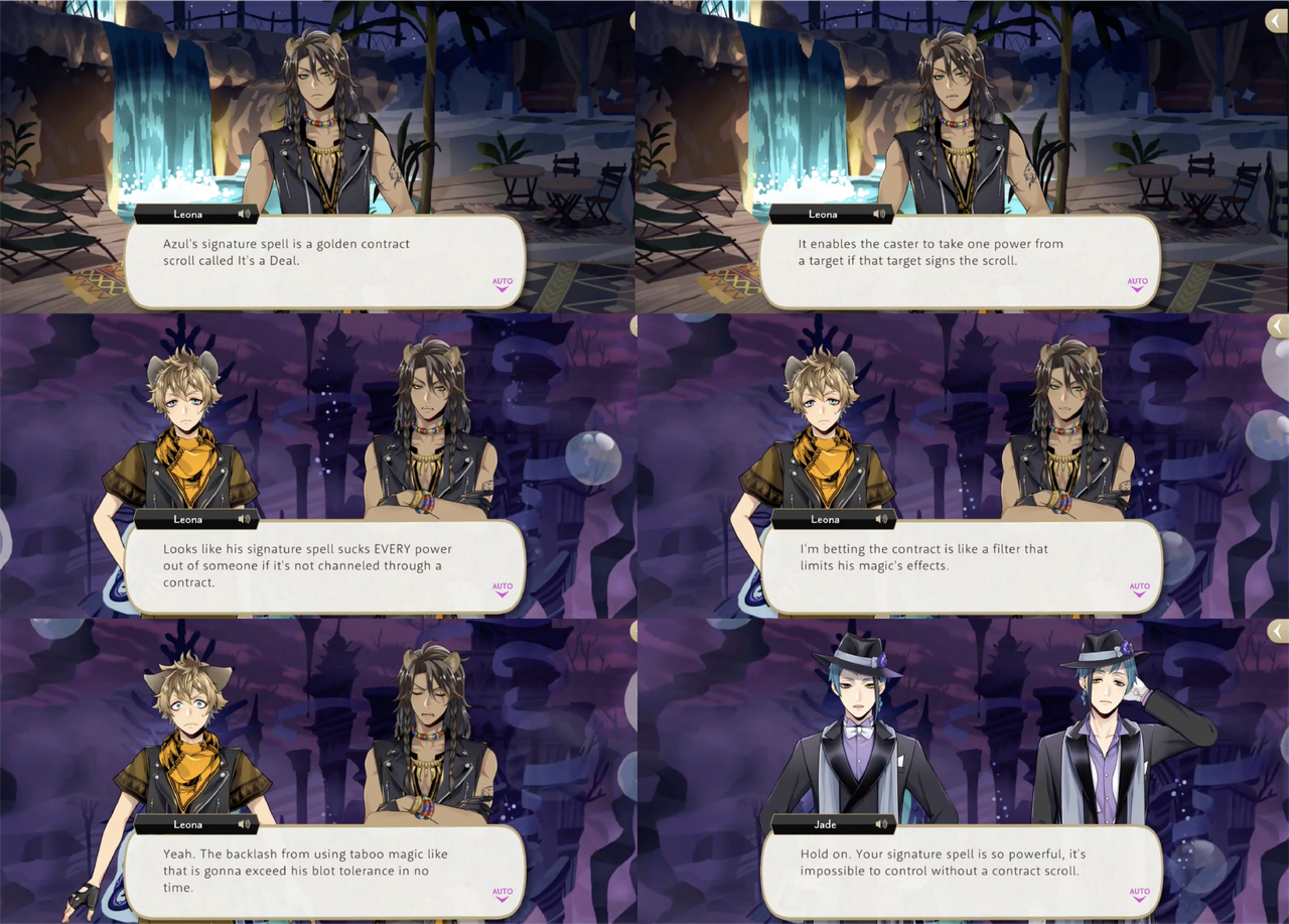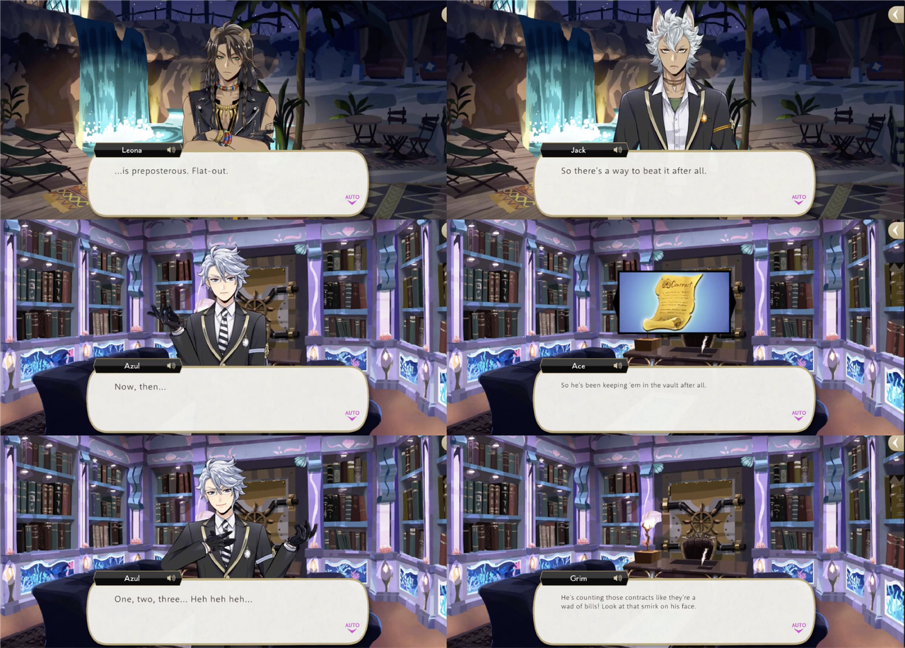 Leona’s response to hearing about the situation, however, is to shred the contracts, with Ruggie pointing out that Azul possibly provided the “on-the-spot demonstration” of “invulnerability” as a bluff. Jack’s group sneaks into Azul’s VIP room to try and destroy a contract that Azul leaves out on his desk, but it electrocutes them. Azul claims that the contracts are “rigged to jolt anyone who touches them aside from (himself),” but this is proven to be a lie: based on the logic that Azul would not need to keep the contracts in a vault if they were untouchable, Leona and Ruggie attempt and succeed at smuggling Azul’s entire collection out of Octavinelle.