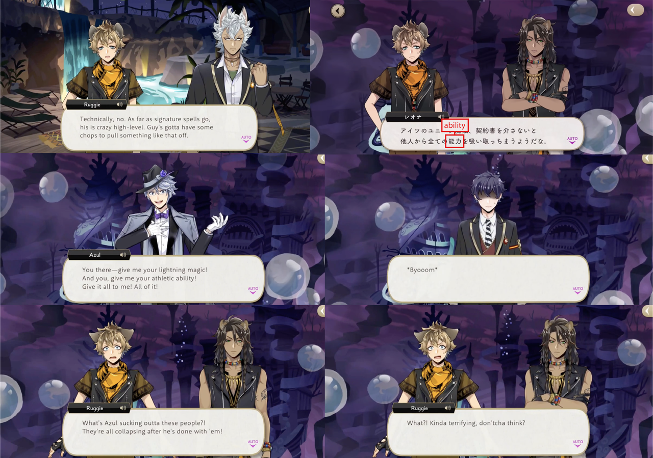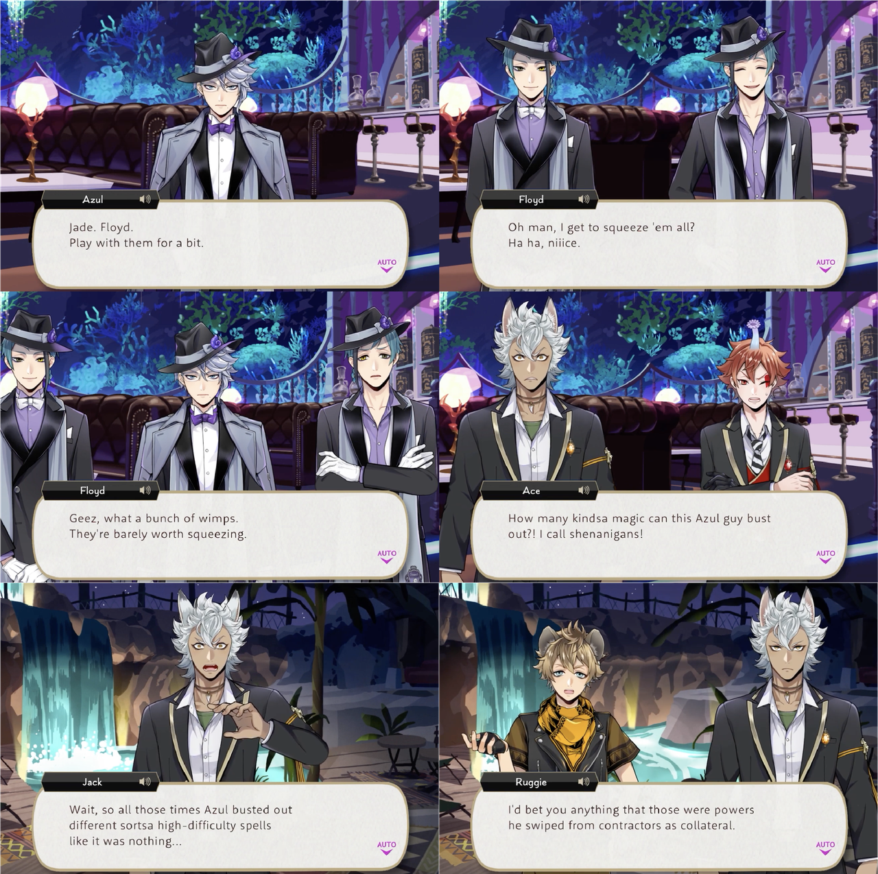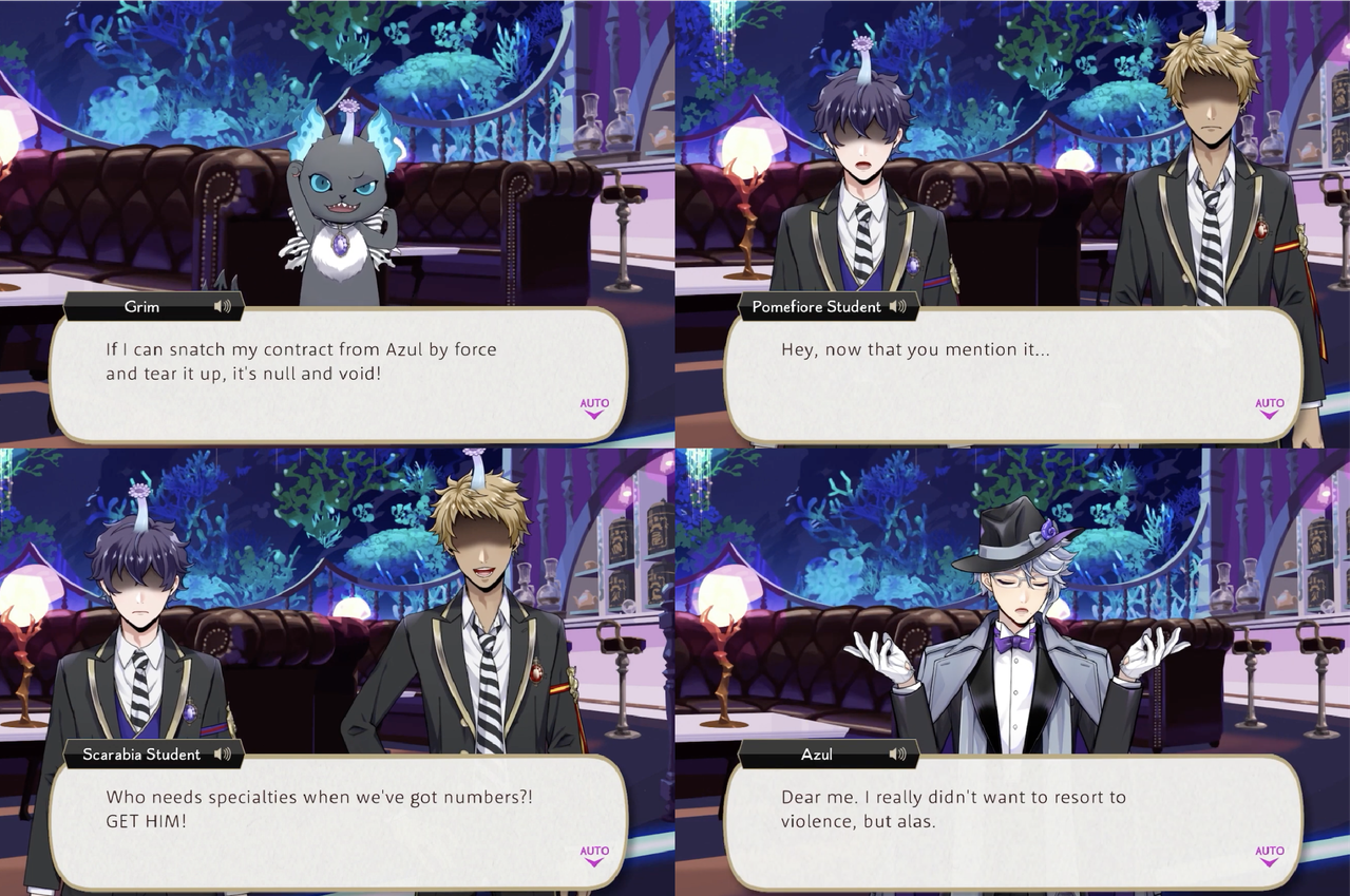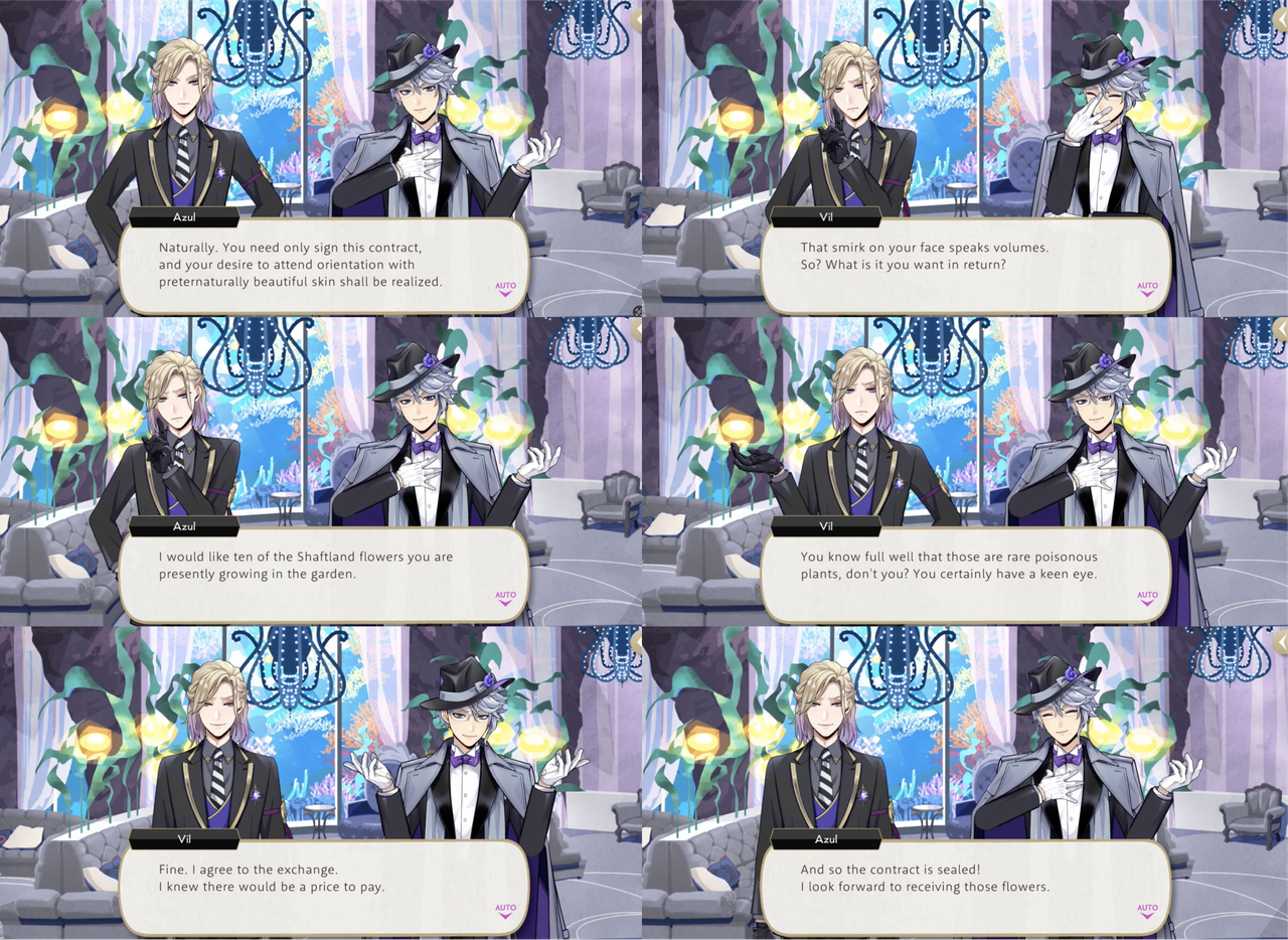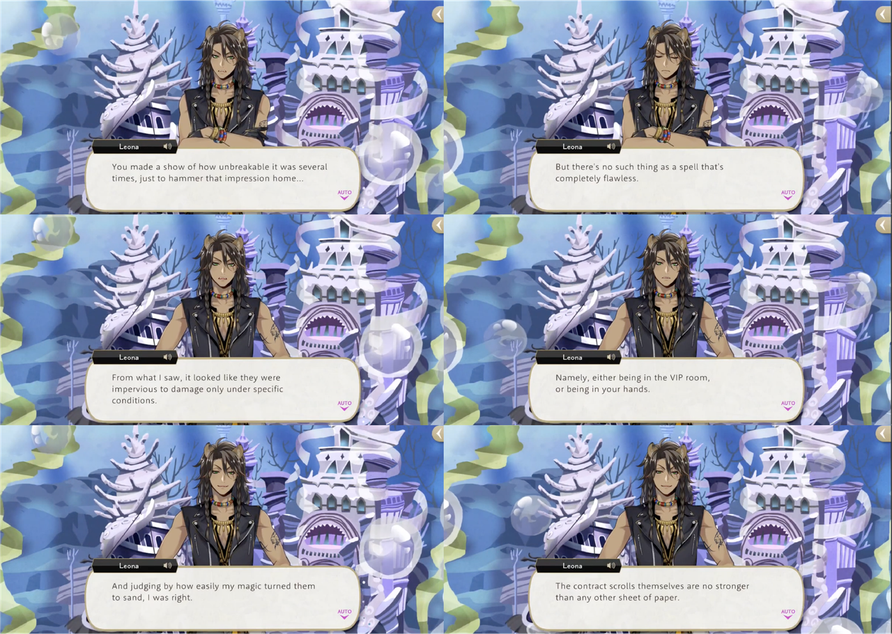 Leona’s response to hearing about the situation, however, is to shred the contracts, with Ruggie pointing out that Azul possibly provided the “on-the-spot demonstration” of “invulnerability” as a bluff. Jack’s group sneaks into Azul’s VIP room to try and destroy a contract that Azul leaves out on his desk, but it electrocutes them. Azul claims that the contracts are “rigged to jolt anyone who touches them aside from (himself),” but this is proven to be a lie: based on the logic that Azul would not need to keep the contracts in a vault if they were untouchable, Leona and Ruggie attempt and succeed at smuggling Azul’s entire collection out of Octavinelle.