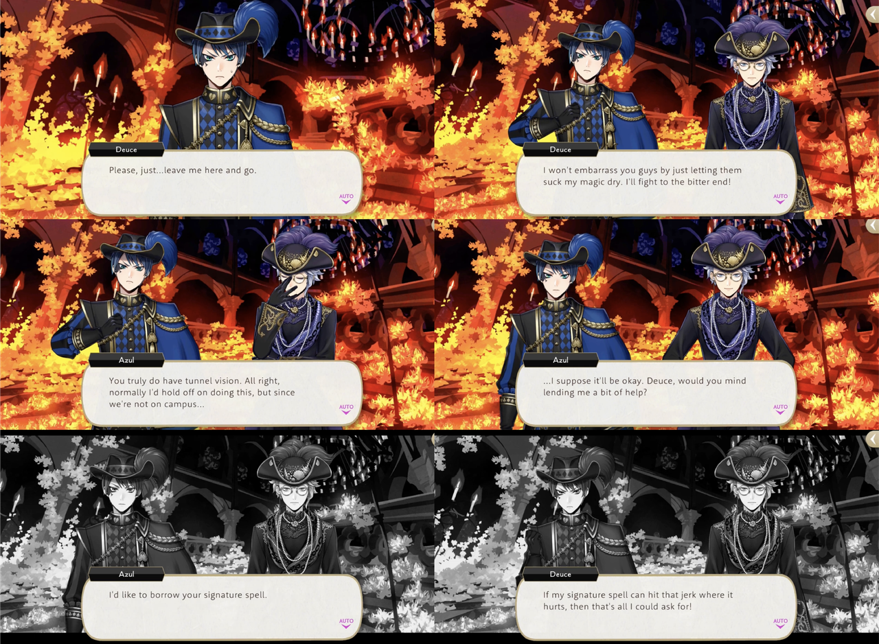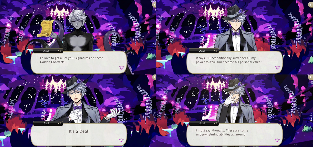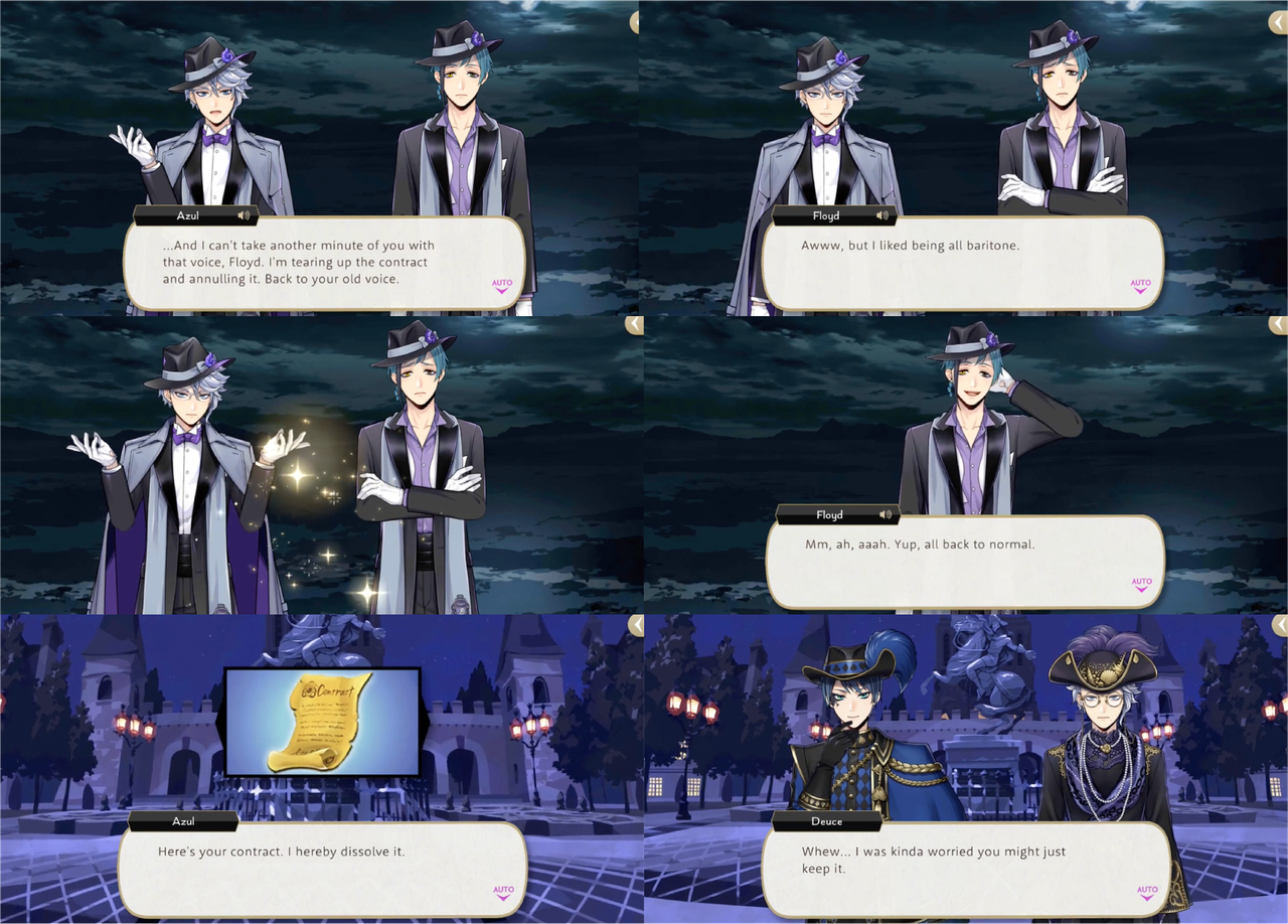 “It’s a Deal” comes up again during Glorious Masquerade when Deuce injures himself saving Idia from a falling chandelier. Azul says, “Normally l’d hold off on doing this, but since we’re not on campus…” and receives Deuce’s unique magic, “Be the Limit,” in exchange for the promise to “hit (Rollo) where it hurts.”