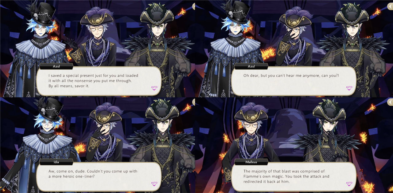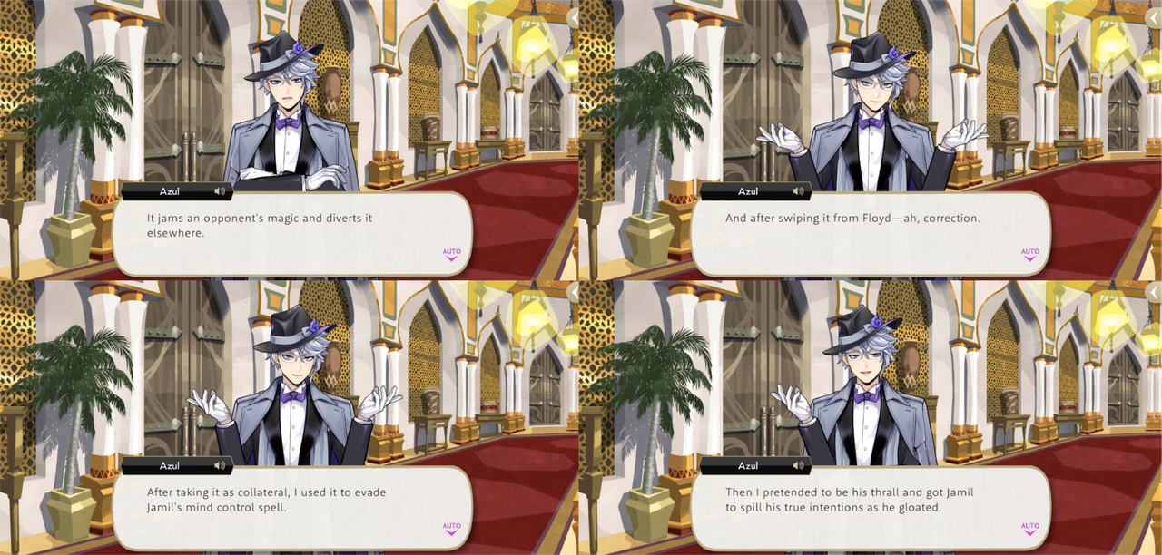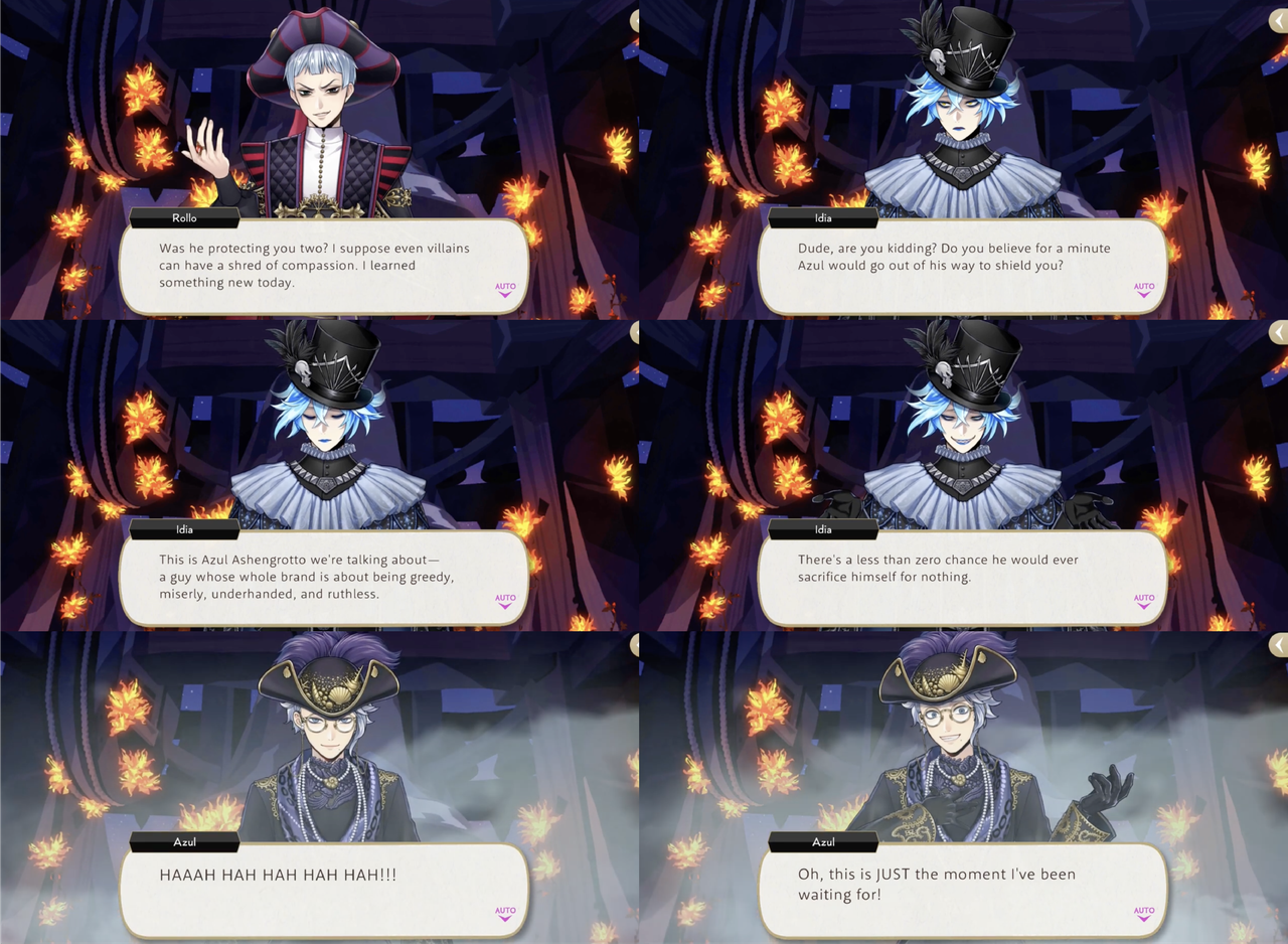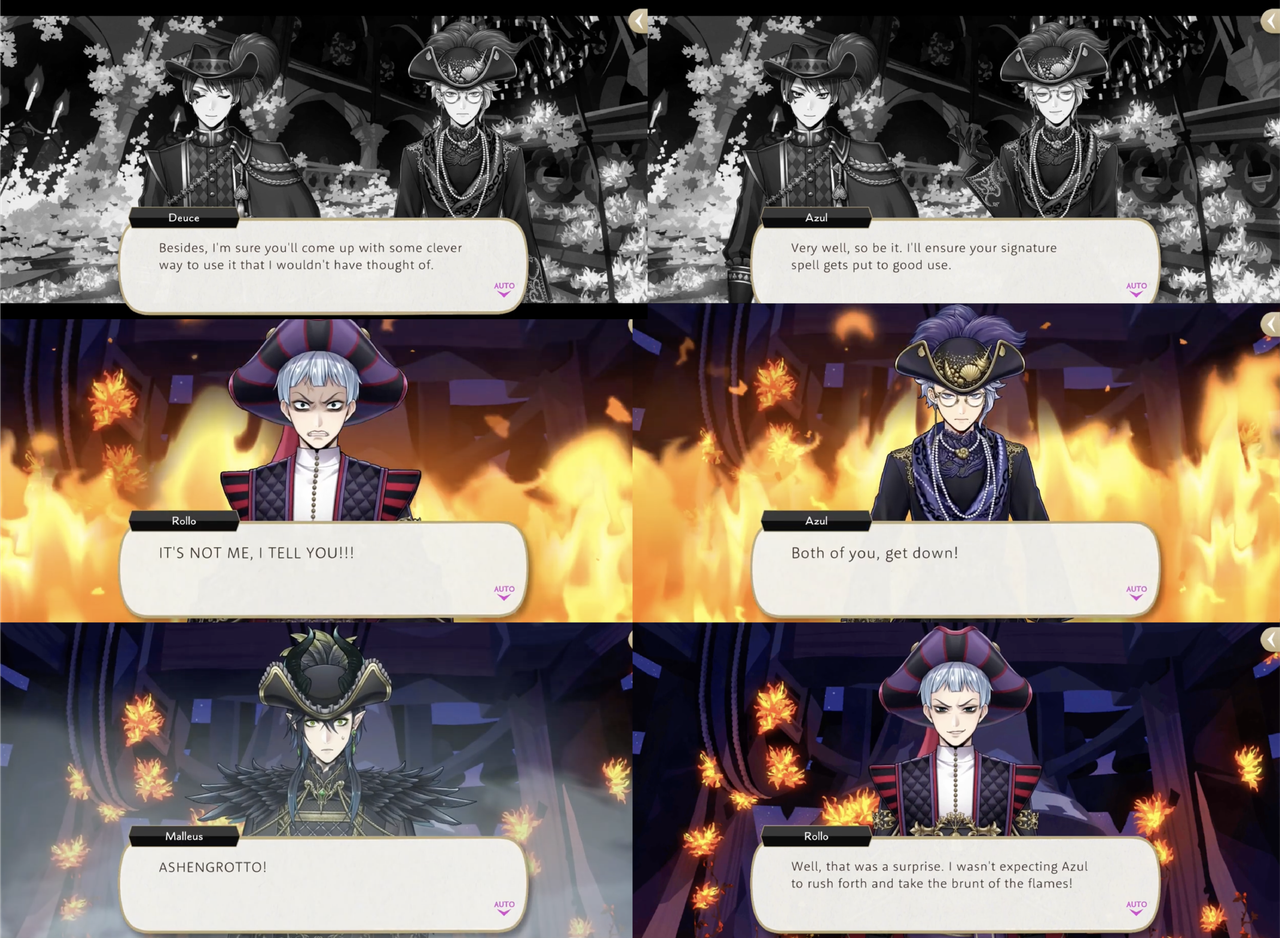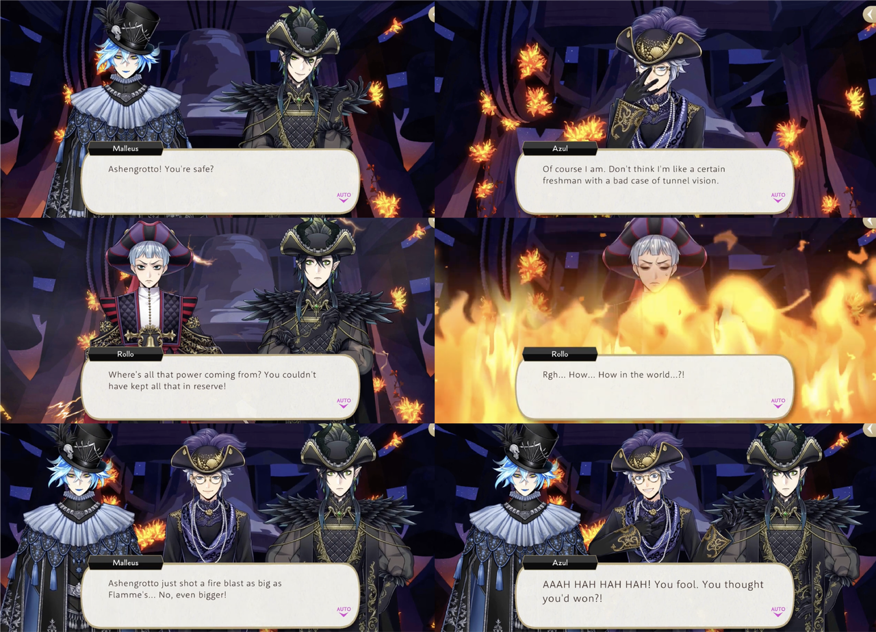 Azul absorbs a strong attack from Rollo in order to charge Deuce’s UM, leading Rollo to believe that he sacrificed himself to protect Idia and Malleus, but Idia explains, “This is Azul Ashengrotto we’re talking about—a guy whose whole brand is about being greedy, miserly, underhanded, and ruthless. There’s a less than zero chance he would ever sacrifice himself for nothing,” at which point Azul unleashes the force of Deuce’s UM on Rollo.