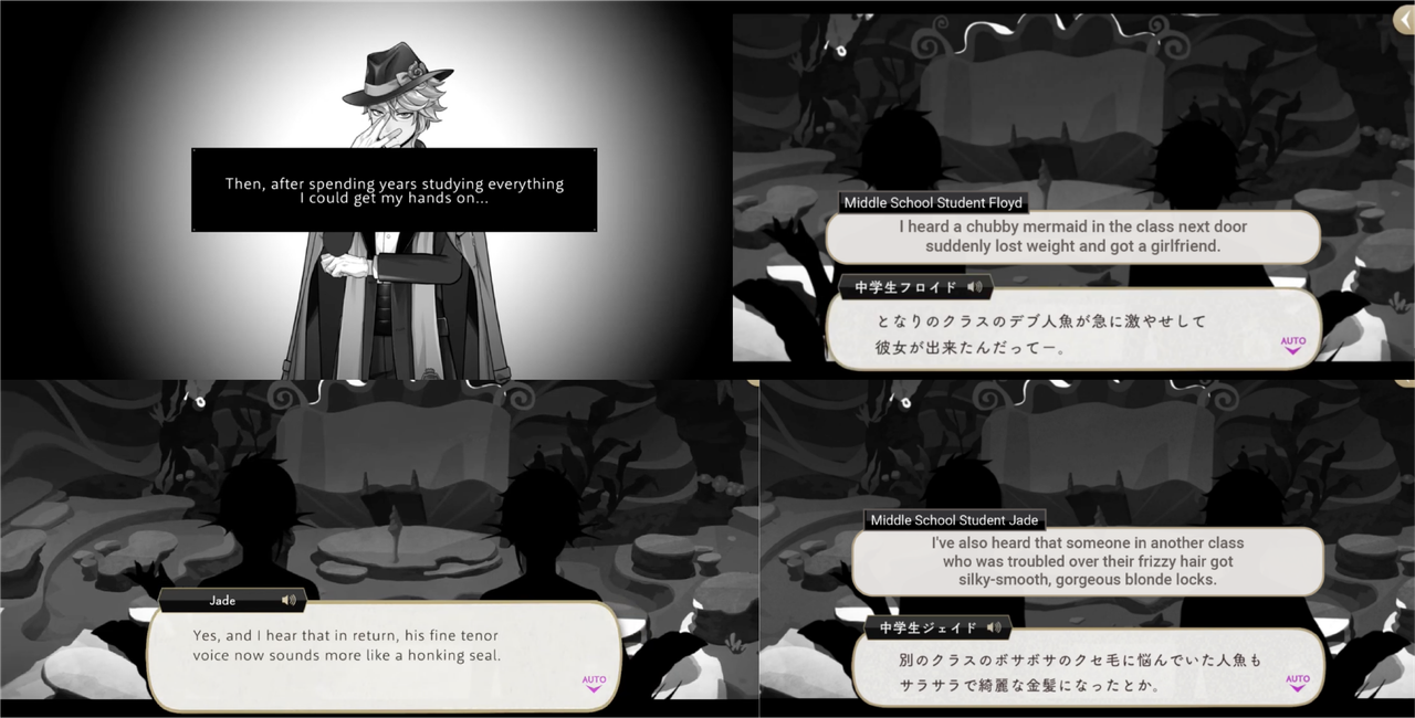 Unlike other unique magics that we have heard of, it seems that Azul intentionally designed his UM in order to enact revenge on people who bullied him. What might be the earliest results of Azul’s unique magic are described by middle-school Jade and Floyd, who talk about a mermaid losing weight and getting a girlfriend but losing their “fine tenor,” and another getting “silky-smooth, gorgeous blonde” hair but losing “the big tailfin they used to dart through the water.”