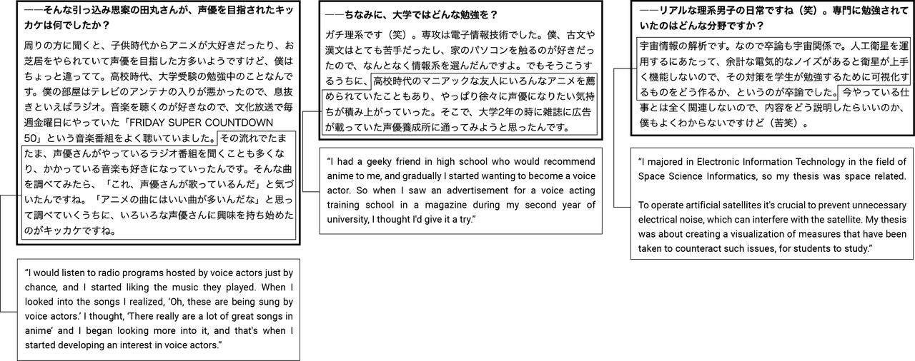 He enrolled in a voice actor training academy during his second year in university while majoring in electronics and IT. His thesis was on learning support tools for satellites; he studied at both schools simultaneously. After graduating he was accepted to his first agency through an open audition for aspiring voice actors. (interview source)