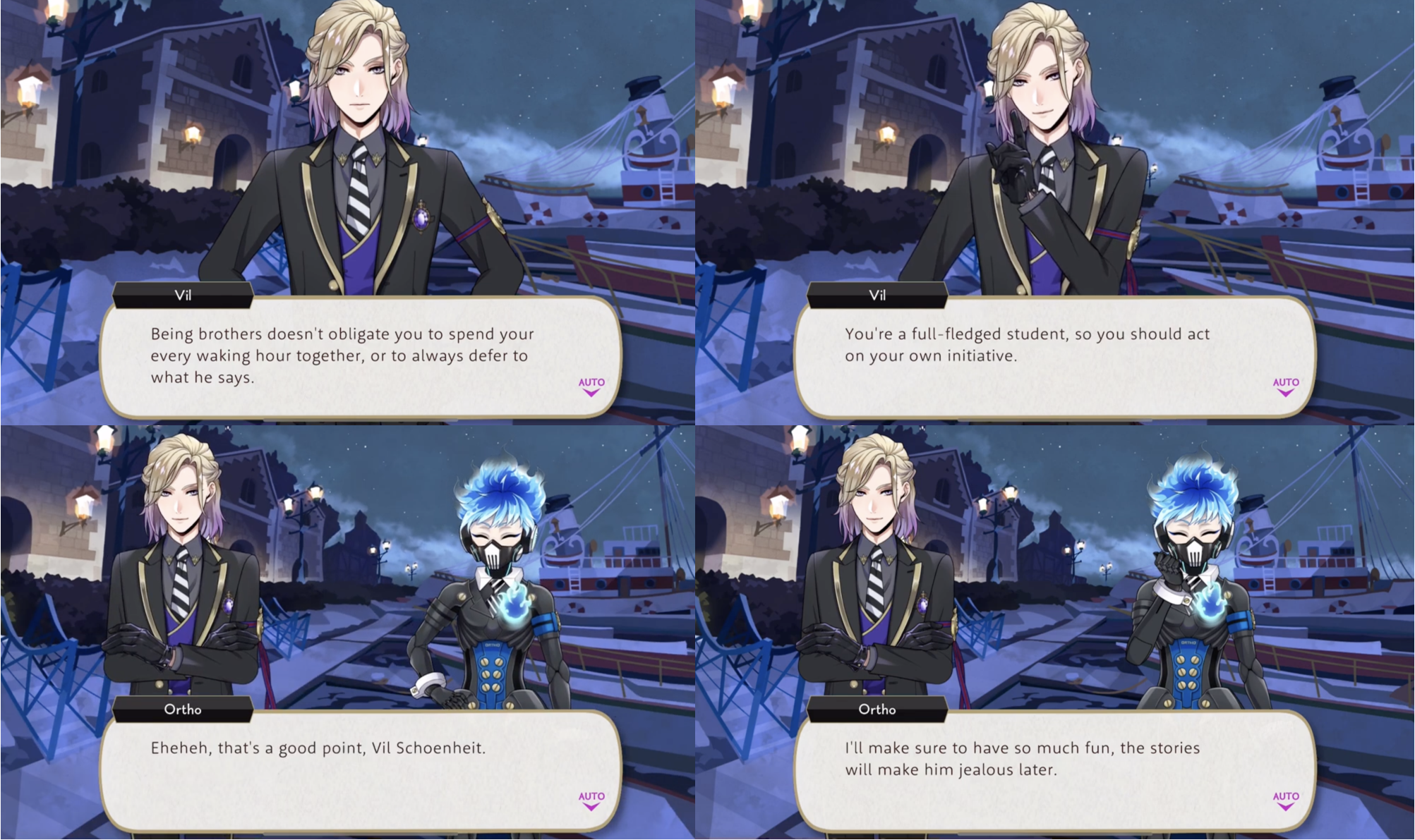 Idia refuses to go to Playfulland with Ortho but Vil says, “Being brothers doesn’t obligate you to spend your every waking hour together, or to always defer to what he says. You’re a full-fledged student, so you should act on your own initiative.