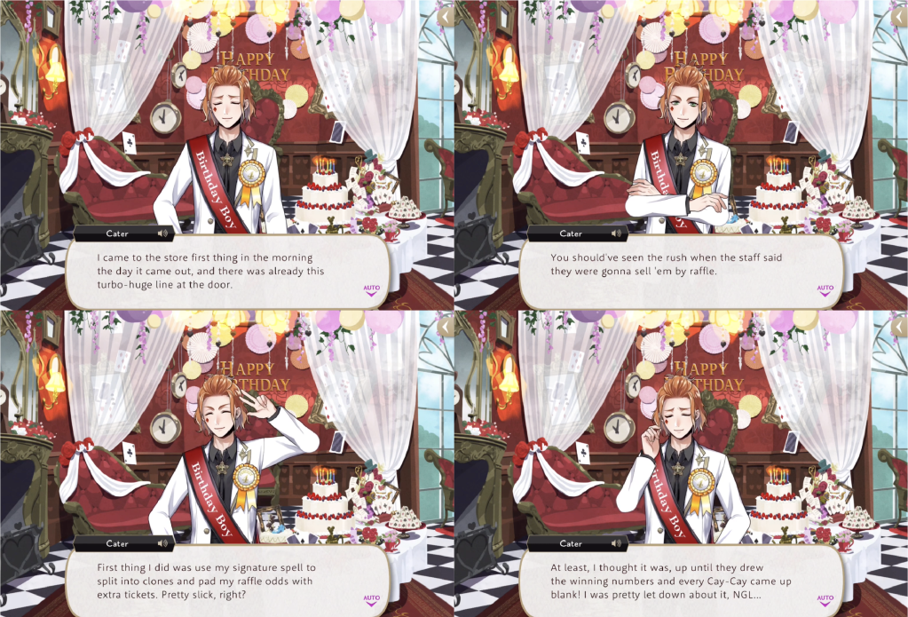 So if you want to tell your senpai you’re going to go eat lunch, you might say “I’m gonna go itadakimasu lunch” (Jade and Azul both use keigo with everyone, it is delightful), but if you’re talking to someone in your grade you might say “I’m gonna go taberu lunch” if you’re Deuce in honor-student mode, or “I’m gonna go kuu lunch” if you’re Ace (“kuu” is a very casual way to say “to eat”. Ace uses it in-game when talking to the player, etc).