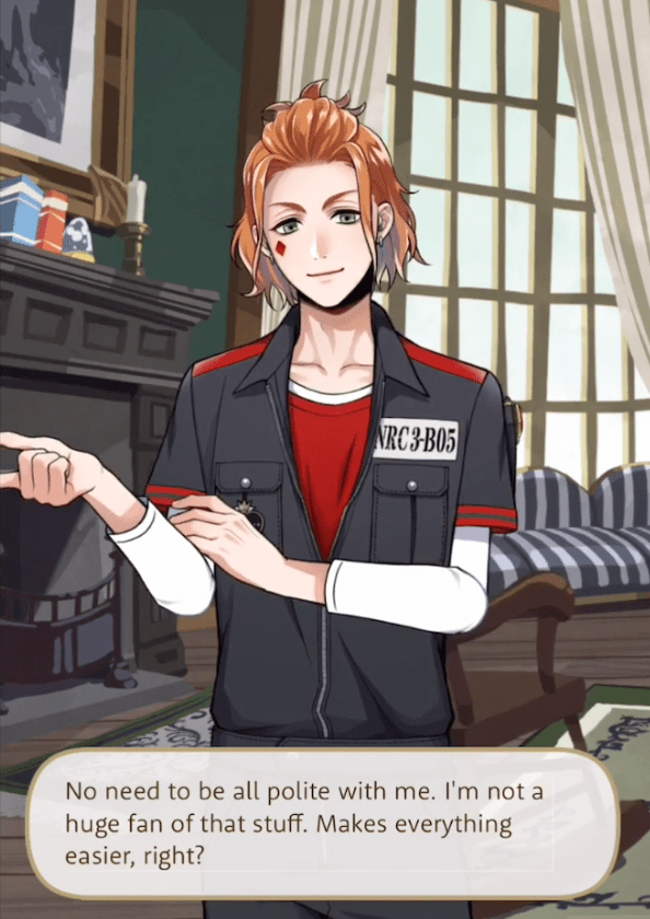 He has a voice line of “No need to be all polite with me” But that’s not exactly what he’s actually saying. His original line is 「無理に敬語とか使わなくていいよ。」, which is literally “You don’t have to force yourself to use keigo.”