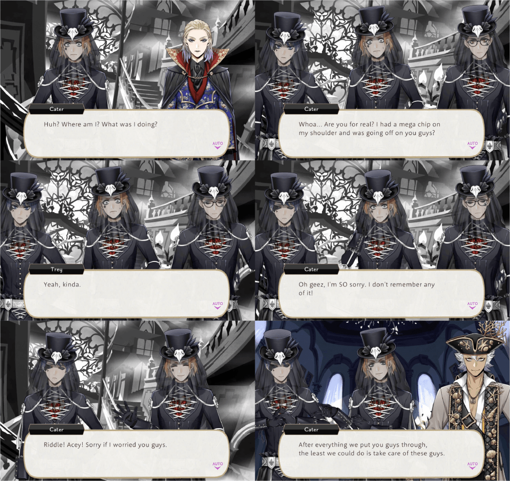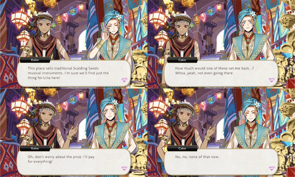 He apologizes multiple times during Spectral Soiree for the actions of the ghost that possessed him and doesn’t allow Kalim to buy expensive souvenirs for Lilia during the Firelit Sky event, insisting that they get something cheaper so that he can afford for them to split the cost equally.