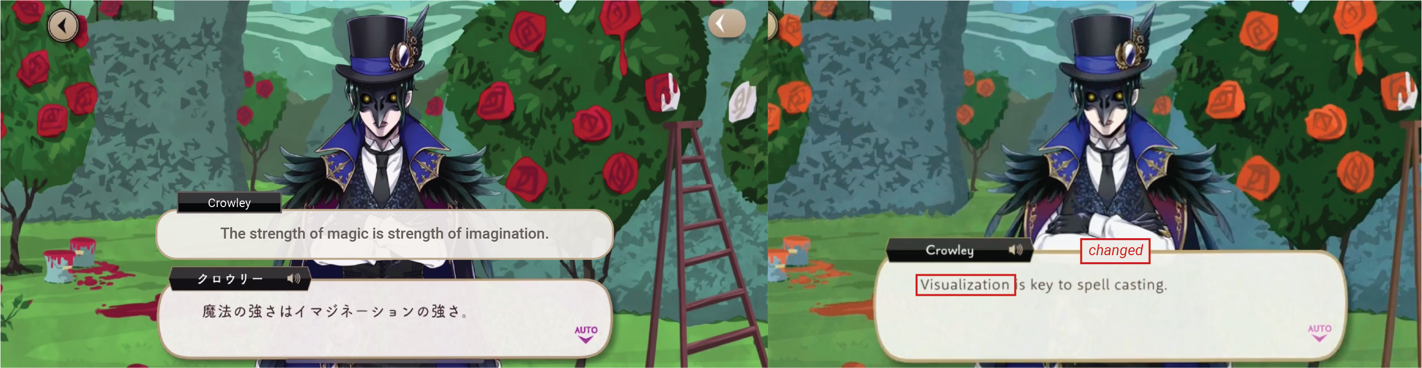 This “hidden meaning” behind the characters’ unique magic is, for the most part, not being reflected on EN, but Trey is unique: EN used the meaning of his spell instead of the audio, so making it look as though what he is saying aloud does not match to his actual dialogue.