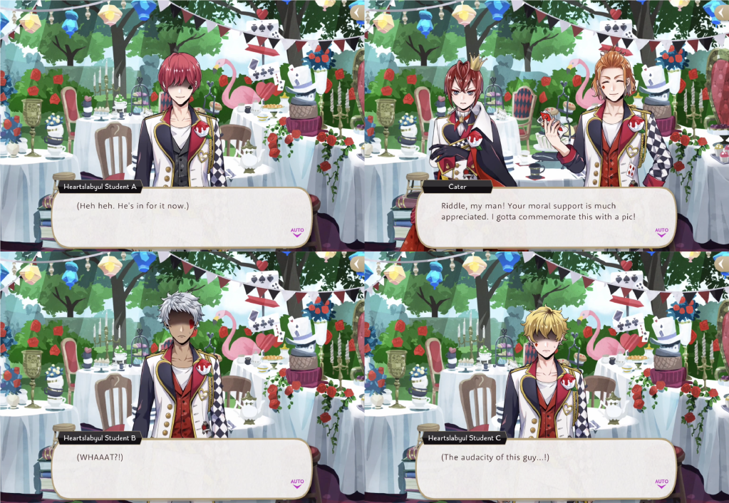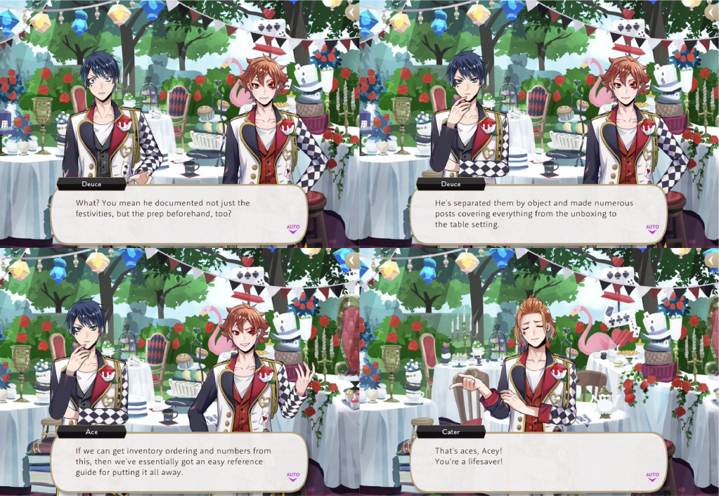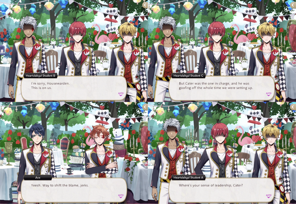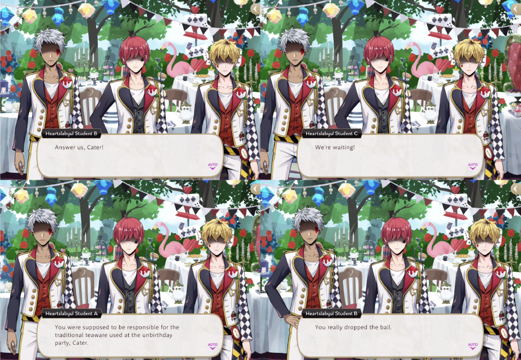 By the end of the event the Heartslabyul students have misplaced the instructions for putting away the teaware and they blame Cater, saying “Where’s your sense of leadership, Cater? Answer us, Cater! We’re waiting! You were supposed to be responsible for the traditional teaware used at the unbirthday party, Cater. You really dropped the ball.”