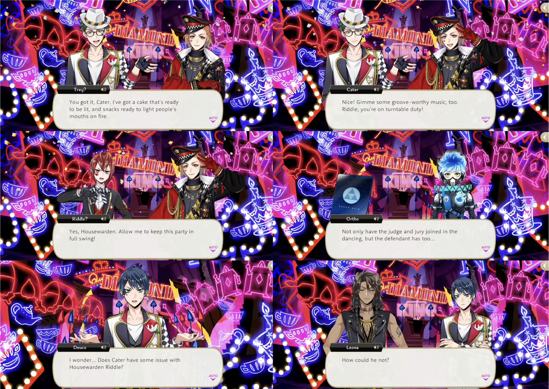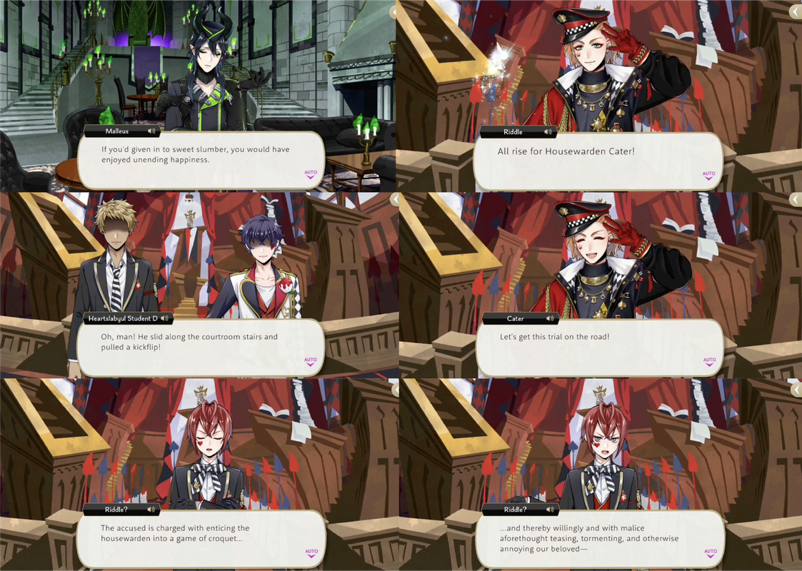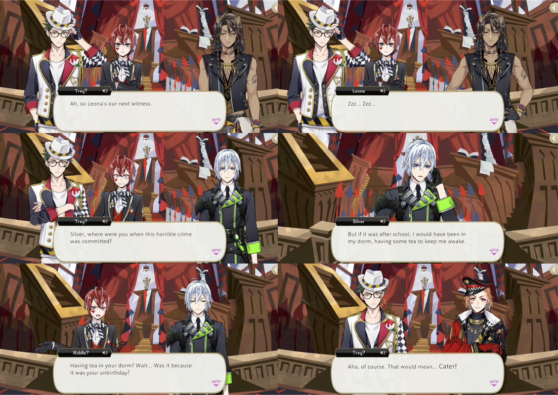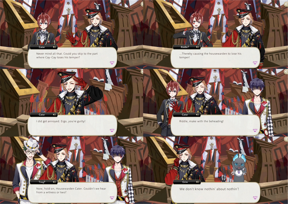 Cater rides a skateboard into the courtroom of Heartslabyul to oversee the trial of a student who has been accused of annoying him during a game of croquet. With dream-Trey’s encouragement he calls the prefect, Grim, Leona and Silver as witnesses.
