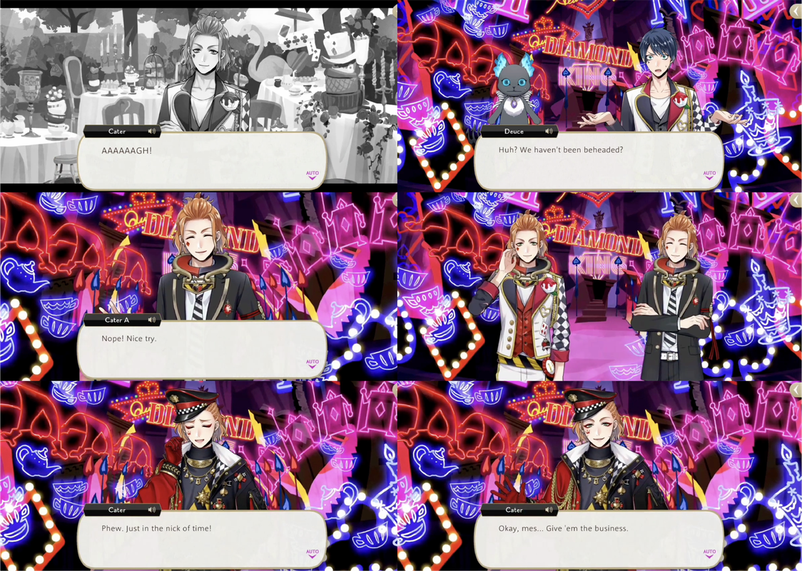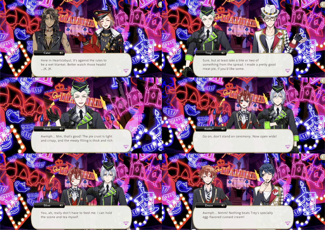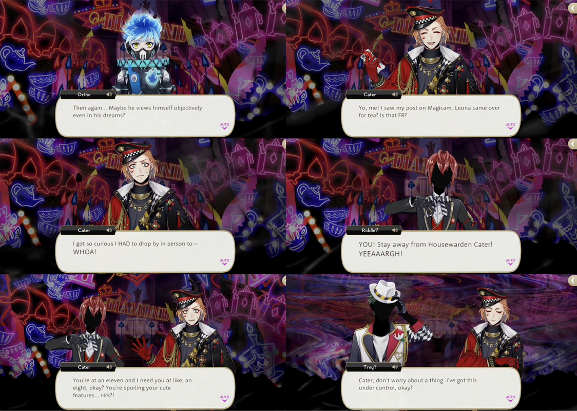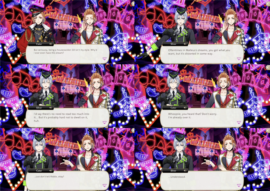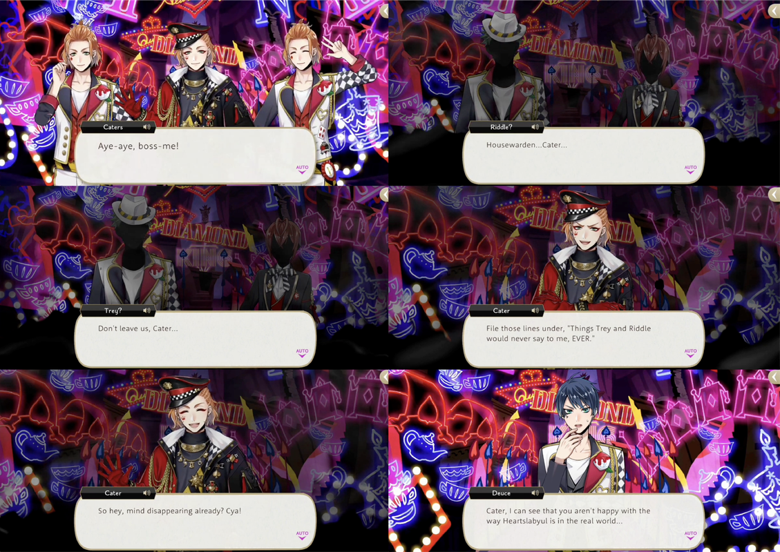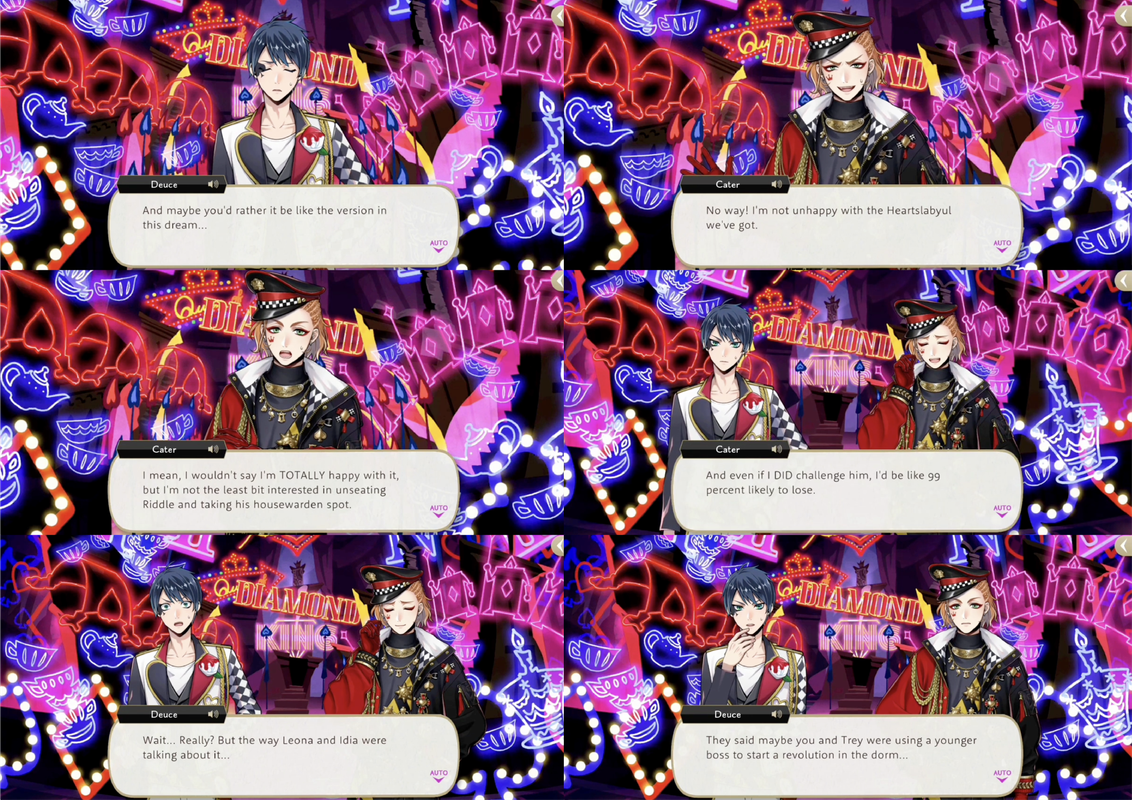 Deuce approaches Cater about being unhappy with Heartslabyul in the real world but Cater assures him that, while he isn’t completely happy with it, he is not interested in taking the housewarden position from Riddle, and would probably lose if he tried.