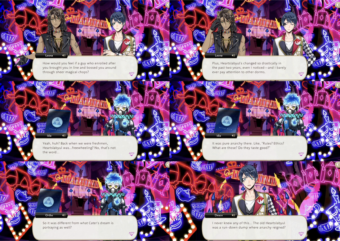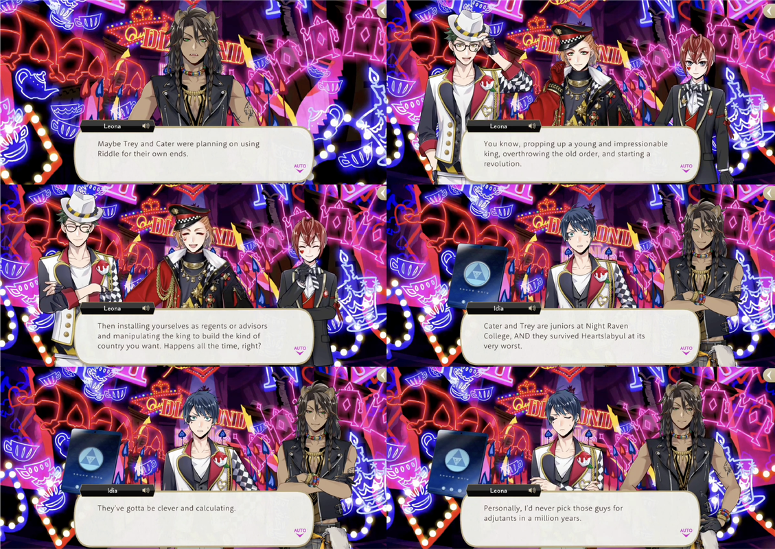 From Leona and Idia we learn that Heartslabyul was “a run-down dump where anarchy reigned” before Riddle, and Leona and Idia suggest that Trey and Cater possibly manipulated Riddle to overthrow the old system: “Manipulating the king to build the kind of country you want. Happens all the time, right?”