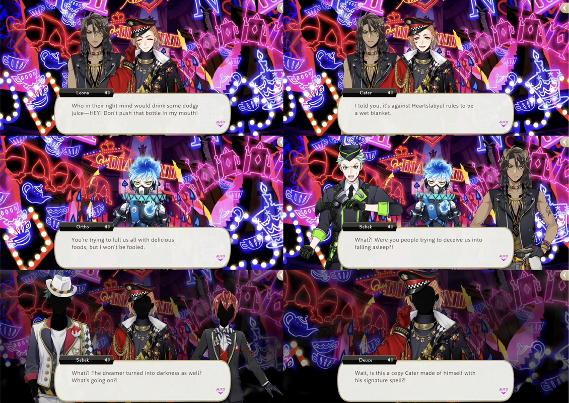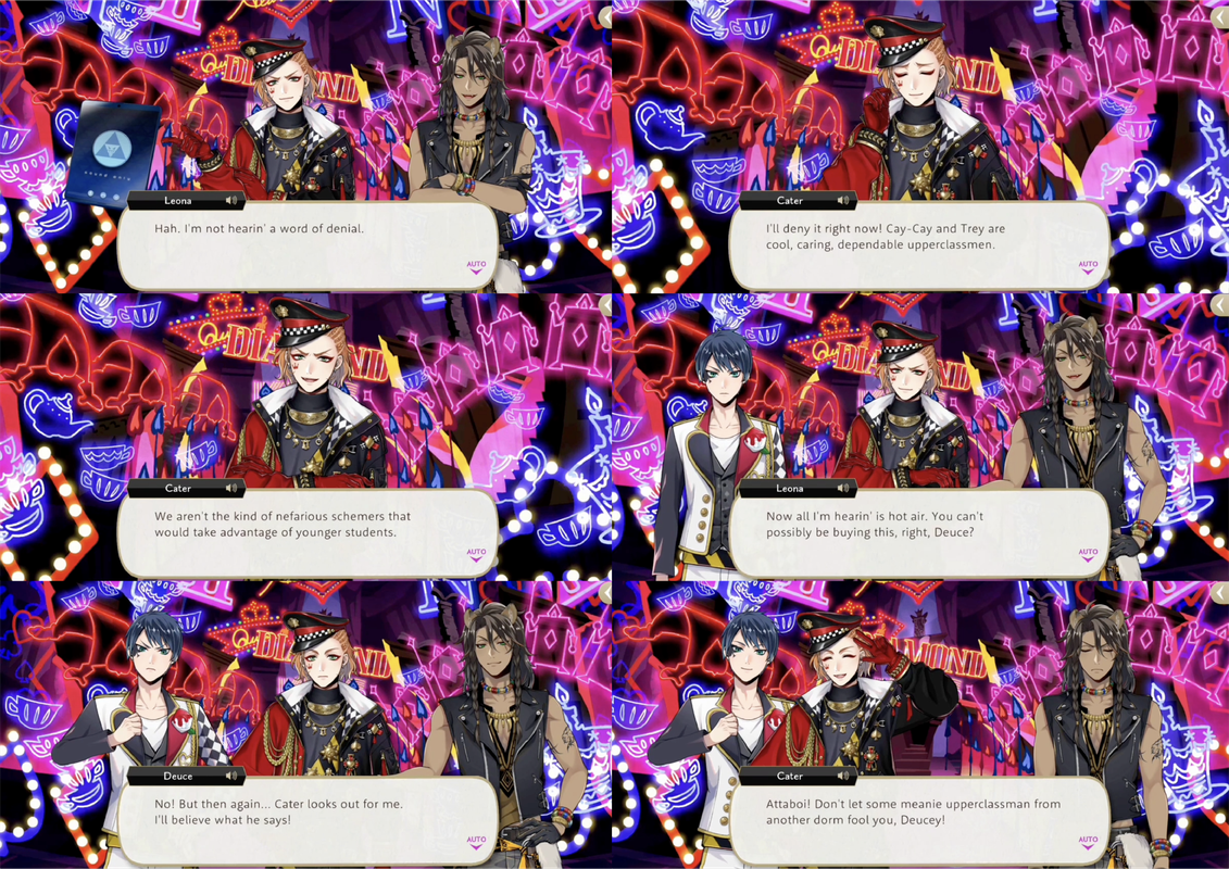 Cater insists that he and Trey “aren’t the kind of nefarious schemers that would take advantage of younger students” and while Leona seems unconvinced, Deuce decides to believe what Cater says.
