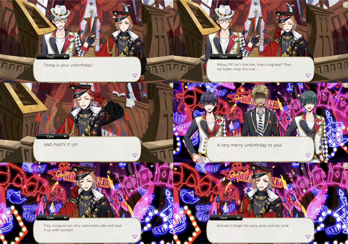 It is discovered that it is Cater’s unbirthday, and the trial becomes an Unbirthday Party. Dream-Trey provides spicy foods, while Riddle DJs.