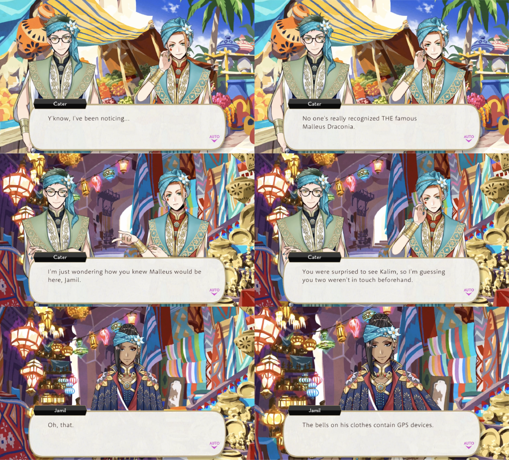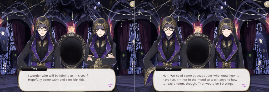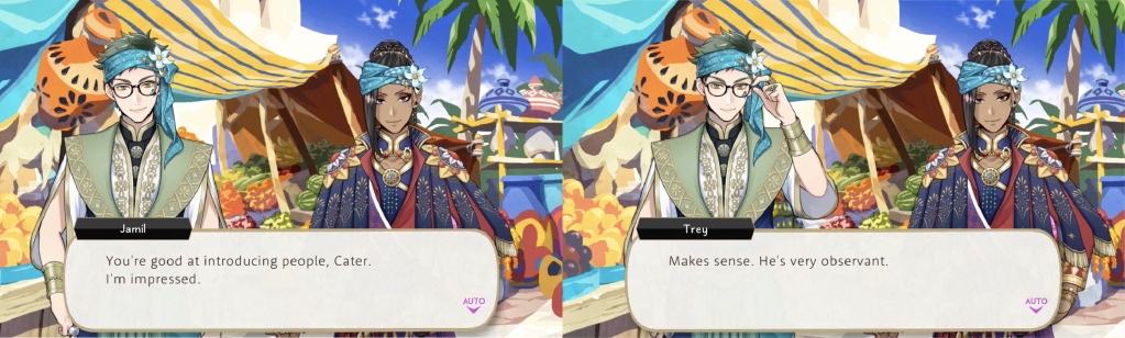 Trey tells Jamil that Cater “is very observant”, and that certainly seems to be the case: we see him telling Ace to read the room in a vignette and commenting on Deuce, Kalim and Malleus being oblivious in Phantom Bride and in Firelit Sky.