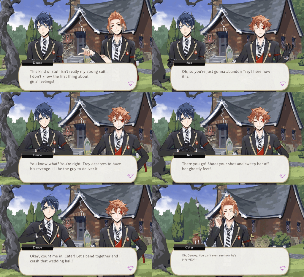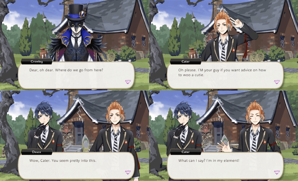 Cater might mention women/dating more than anyone else, saying he is in his element “if you want advice on how to woo a cutie”, that Trey’s magic “has gotta be a hit when Trey’s having tea with the ladies” and asking Ace for “a party trick that’ll impress the ladies!”