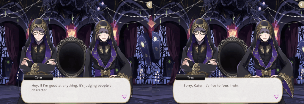In his Ceremonial Robes vignette Cater makes a bet with Trey to guess which new students are to be assigned to Heartslabyul, as “If I’m good at anything, it’s judging people’s character”, but he then loses the game five to four, so we can’t be sure how accurate this claim is.