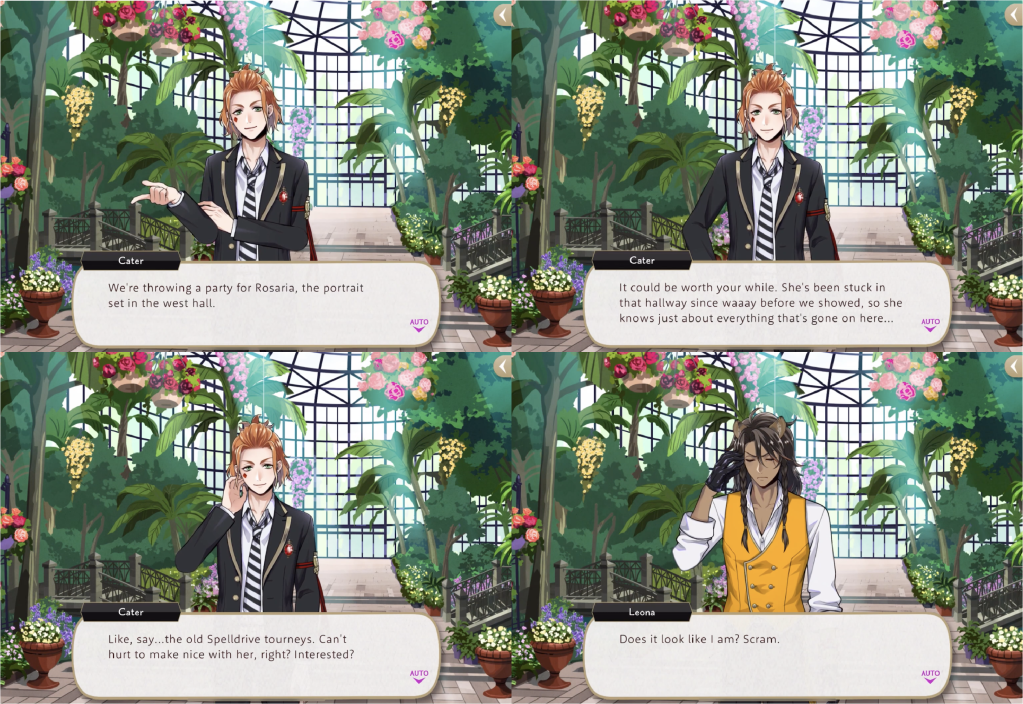 By the end of the vignette both Kalim and Leona are led away by Jamil and Ruggie and it is revealed that Cater’s motive was to hear what was going to be on an upcoming history exam, as Rosaria’s portrait is hung outside of the faculty office.