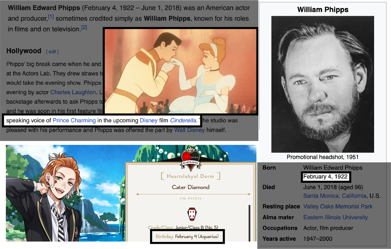 Cater also shares a birthday (February 4) with the voice actor of Prince Charming from the original movie, William Edward Phipps.