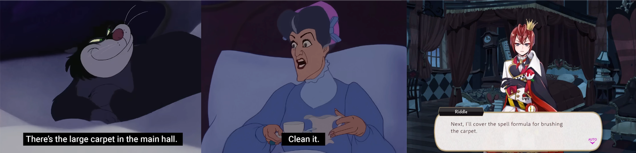 Riddle starts sharing pictures that do not make much sense to Cater, who wonders why Riddle is sharing photos of things like a broom and a rag, both of which Cinderella is seen using in the original animated movie.