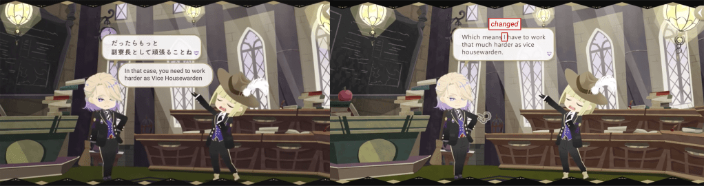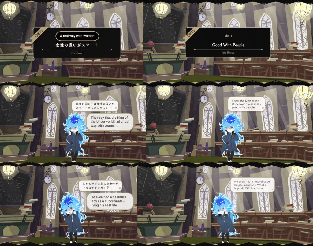 Idia’s Chat about the king of the underworld having a way with ladies was changed to “Good with People” on EN, and his “beautiful lady as a subordinate” was changed to “a helpful super helpful assistant.”