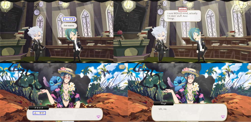 This localization is not incorrect at all, but I enjoyed the difference between EN Floyd’s cute grumbling and the simplicity of his γ€γ on JP ^^